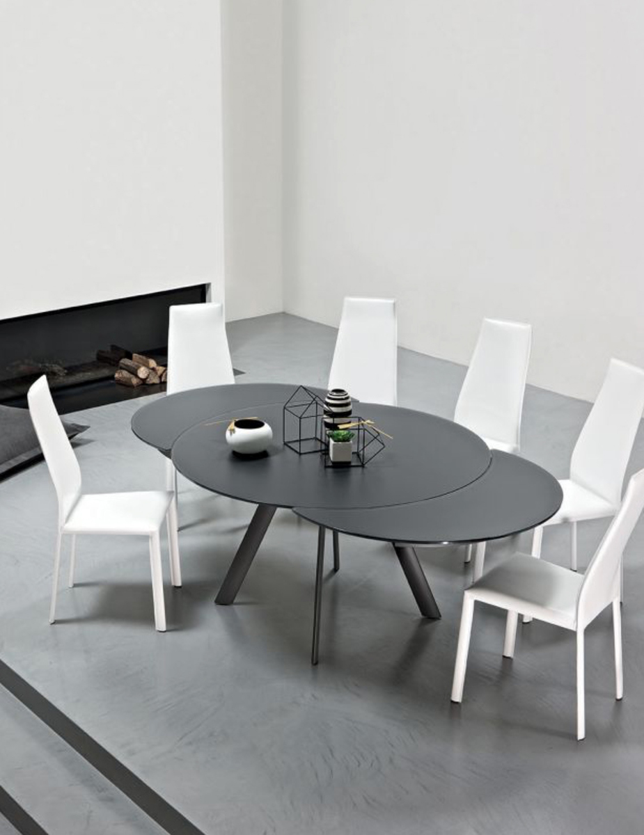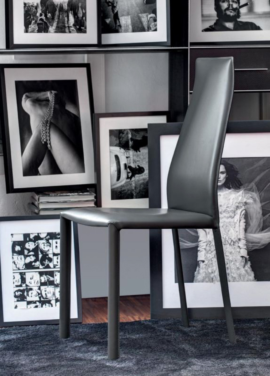 This Dalila Chair features a sinuous profile, minimalist style, and is available with a high or low back and in various colors. Upholstered in napa hide leather.