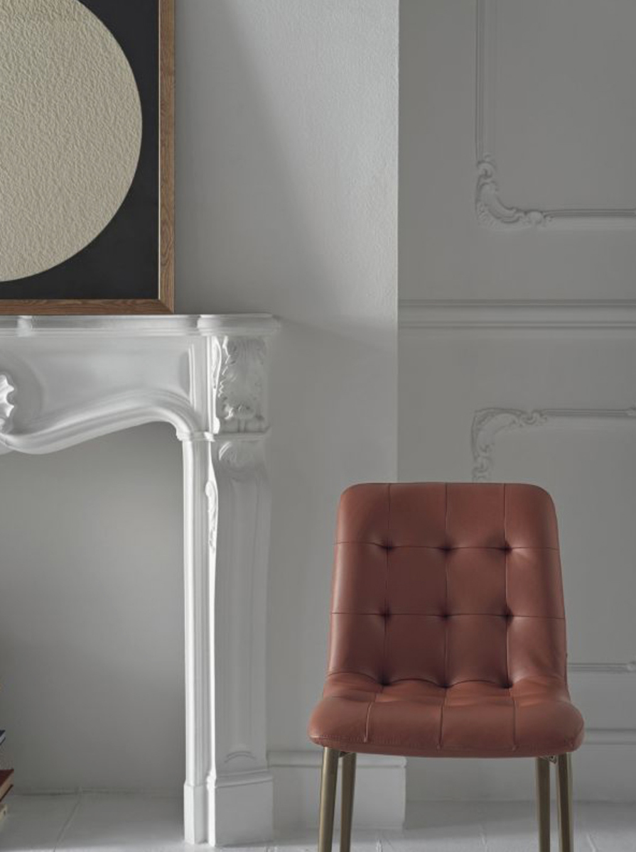 This Kuga Slim Chair features a die-cast aluminum frame, and is upholstered and covered in eco leather, velvet, mambo fabric, lulù fabric, virgin wool, and premium napa leather.