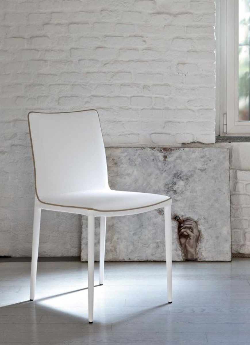 This Nata Chair is softly upholstered with a metal frame and flexible, ergonomic back. Available in eco leather, velvet, mambo fabric, lulu fabric, deco fabric, virgin wool, and napa premium leather.