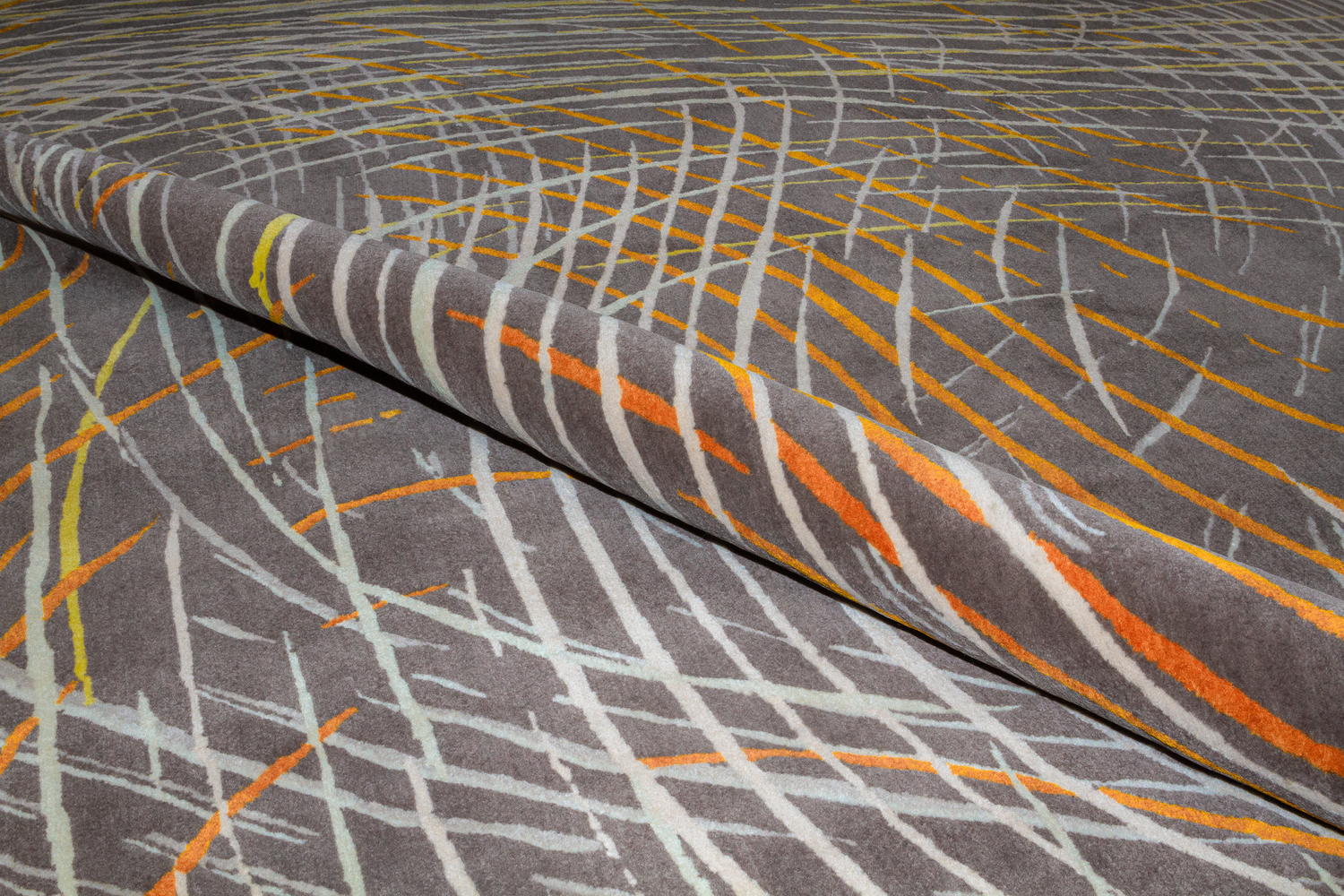 Designed by Fida Nehme and Eva Sutton, Helix is a swirling vortex of directional energy. Technically a “colorful” rug. Helix’s colors are contained within narrow, curved silvers distributed evenly so that no one color dominates. The colors equalize each other and the effect is a rug that’s both colorful and neutral.