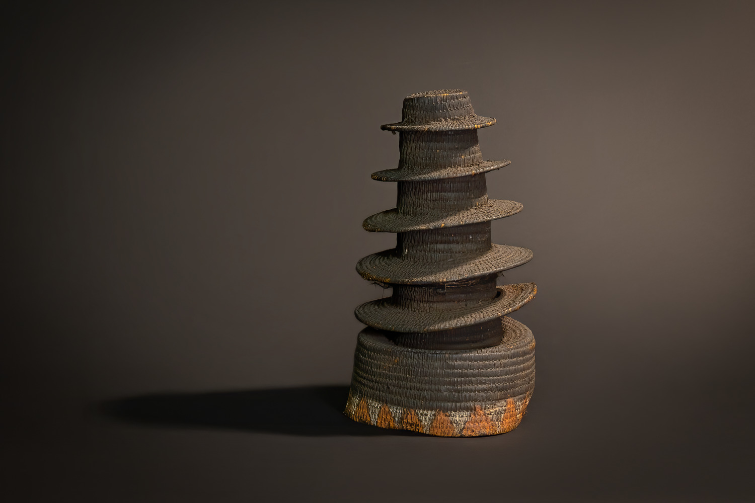 The headdress rises in a stately series of concentric brims, tightly coiled and layered with refined proportionality. Each tier is accentuated by time-worn flecks of ochre and camwood pigment—remnants of ritual application. The base displays a continuous band of chevron-like motifs painted in faded white, red oxide, and clay brown, likely symbolizing territorial lineage, river deities, or protective spiritual thresholds.