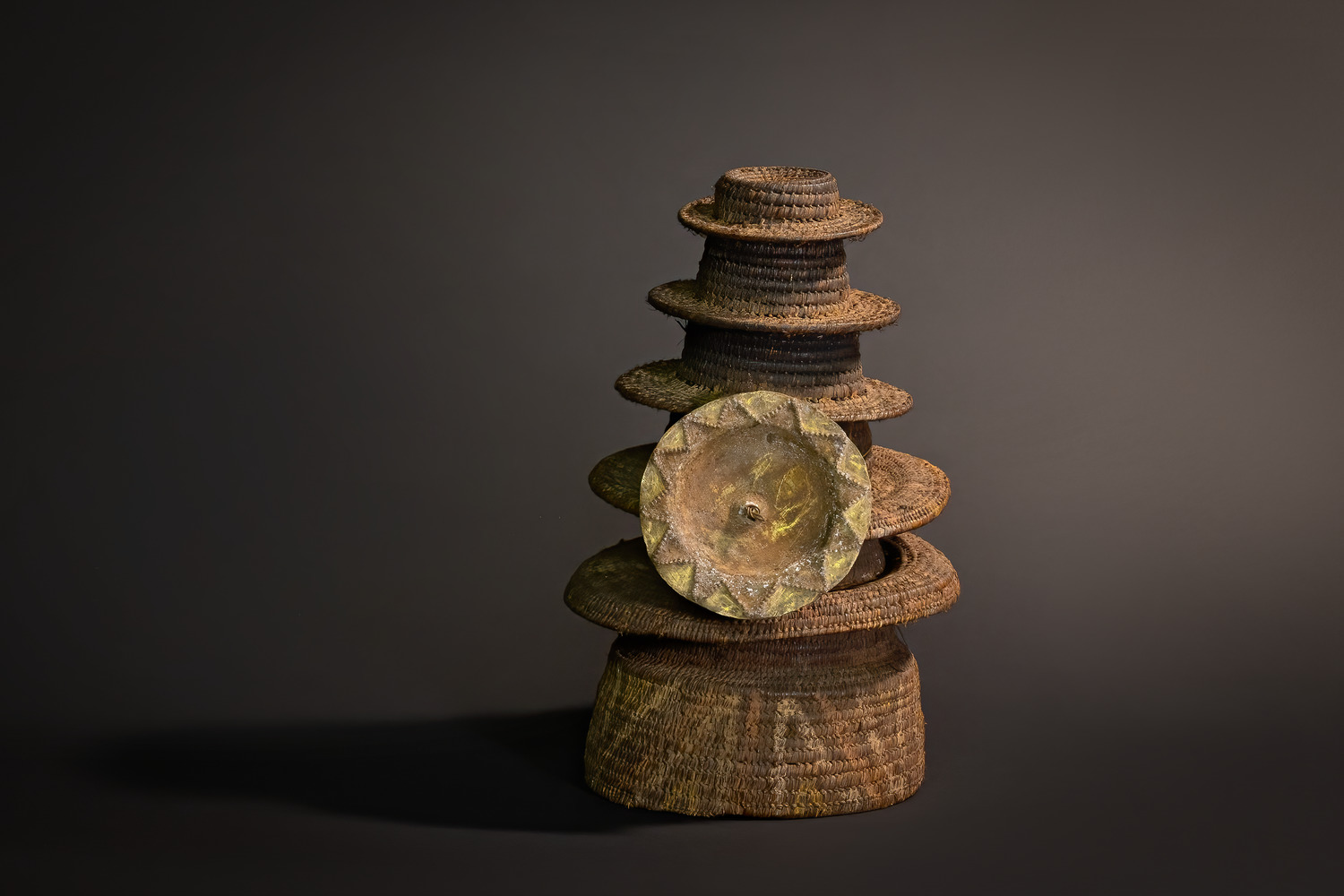 This powerful Botolo hat from the Ekonda people of the Democratic Republic of the Congo presents a compressed yet dignified verticality, ascending in seven firm tiers capped with a striking brass disc etched in a radiating star motif. Acquired in Kinshasa in the early 1970s from a young prince of prominent lineage, the hat embodies both sacred compactness and ceremonial grandeur—a regalia piece meant for both presence and movement in public ritual.
