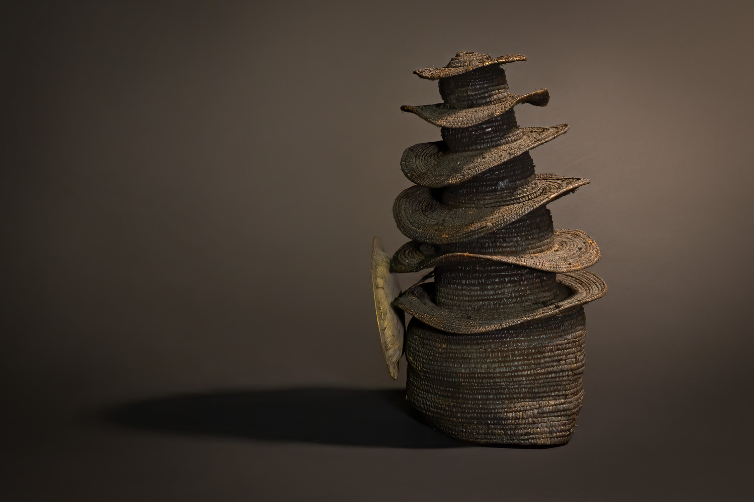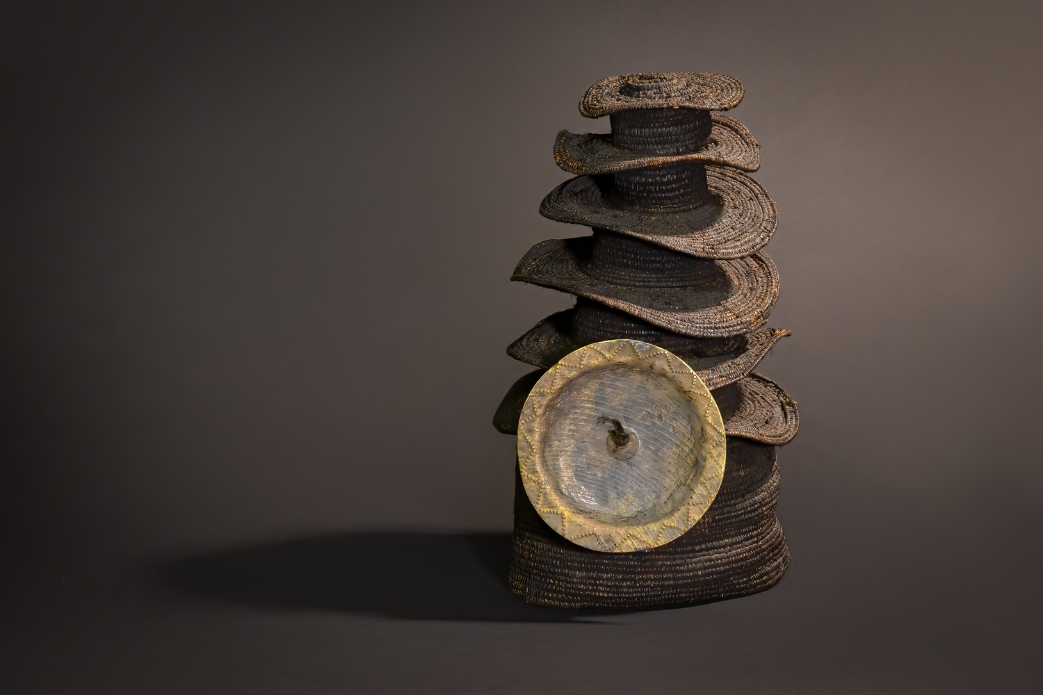 Composed of multiple concentric brims, each meticulously handwoven from natural forest fibers and coiled to form a pagoda-like silhouette, this ceremonial hat presents a visual architecture of social hierarchy. Rising in elegant, undulating tiers, the form speaks to the stratified knowledge and power held by the wearer. Fronting the base of the structure is a large, patinated brass medallion—symbol of affluence, leadership, and divine favor.