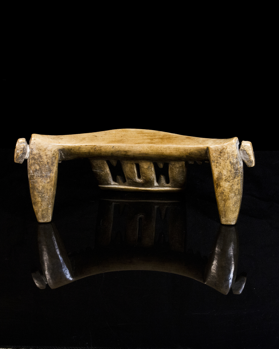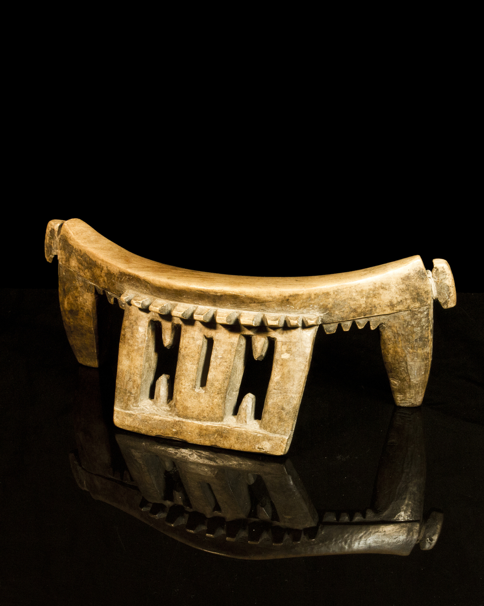 This headrest was constructed by the Dinka People of the Republic of South Sudan. Typically, these headrests feature two or three (as in this object) legs or “links.” The piece is further distinguished by its carved teeth and angular, sculpted ornamentation, which for women, also functions to situate the hair so it does not mangle while sleeping. By social custom, the headrest is also conceptualized as a vehicle for communication with Dinka ancestors: “…dreams are considered to be sent by ancestors, and because dreams are dreamt on headrests, the headrest is a kind of antenna, and the strength of the signal is increased if the headrest is inherited from a senior relative.”