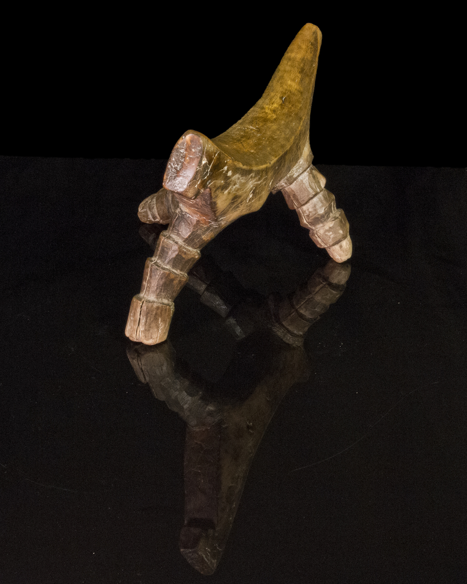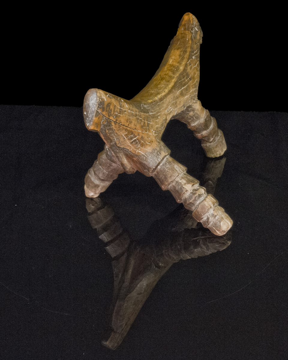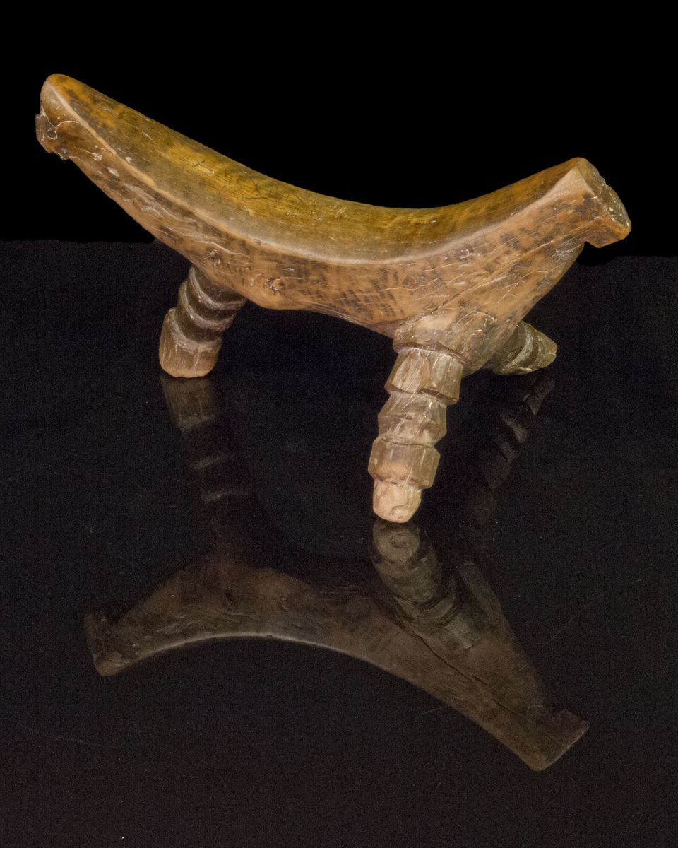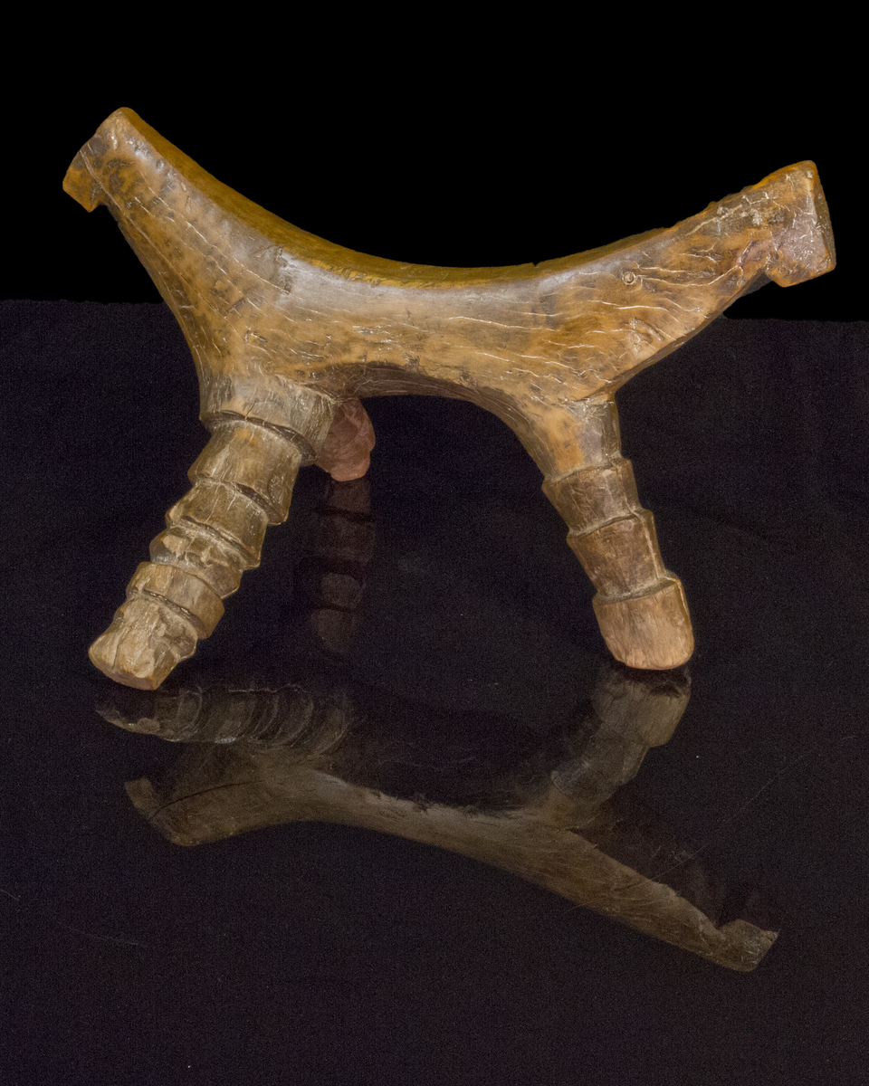 This headrest was constructed by the Dinka People of the Republic of South Sudan.Typically, these headrests feature two, three (as in this object) or four legs or “links.” By cultural tradition, the headrest is also conceptualized as a vehicle for communication with Dinka ancestors: “…dreams are considered to be sent by ancestors, and because dreams are dreamt on headrests, the headrest is a kind of antenna, and the strength of the signal is increased if the headrest is inherited from a senior relative” (Nettleton 2007).