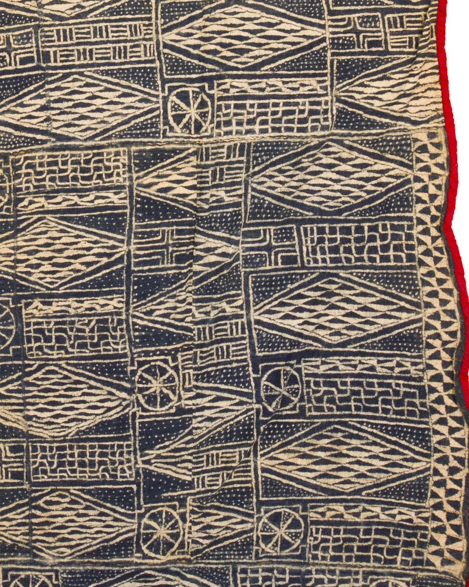 The cloth’s striking cobalt indigo ground is articulated with a bold yet highly structured vocabulary of repeating geometric motifs in soft ivory. These designs, applied by raffia-stitch resist before dyeing, exemplify the sophisticated abstraction practiced by Bamileke artisans. The interlocking diamond lozenges symbolize fertility, continuity of lineage, and the cyclical nature of life. The intersecting lattice grids and rectilinear bands allude to community structure, order, and harmony under the guiding influence of the ancestral spirits. The prominent sun-wheel or rosette forms interspersed throughout the pattern serve as cosmic symbols, evoking the omnipresent spiritual forces protecting the kingdom.