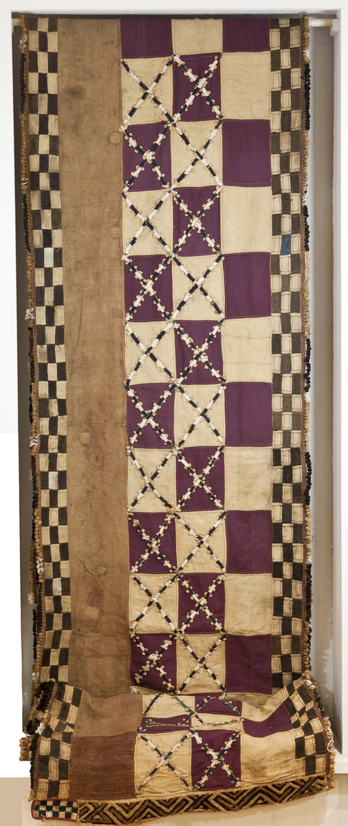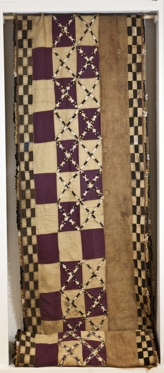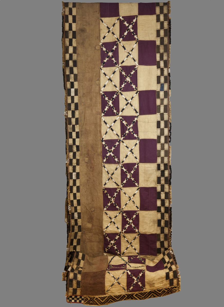 This skirt presents a dynamic composition of checkerboard fields, deep violet and earthy tan panels, and alternating bands of subtle tonal shifts. A central section features an exquisite lattice of diamond motifs, hand-appliquéd and embroidered, their intersecting lines embellished with carefully attached cowrie shells and beads. This star-like pattern radiates across the cloth with a sense of cosmic order, earning this piece the name The Royal Constellation.