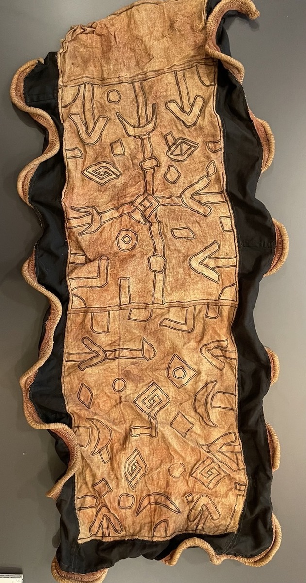 Worked in a palette of warm earth tones and animated by intricate linear embroidery, the composition reveals a harmony of angular and curvilinear motifs—abstract forms that carry both aesthetic force and symbolic resonance. The oscillating lines and interlocking shapes create a dynamic visual cadence, echoing the innovations for which Kuba textile designers are celebrated. Each motif, traditionally assigned a name, honored the ingenuity of its originator while affirming the shared cultural memory of the community.