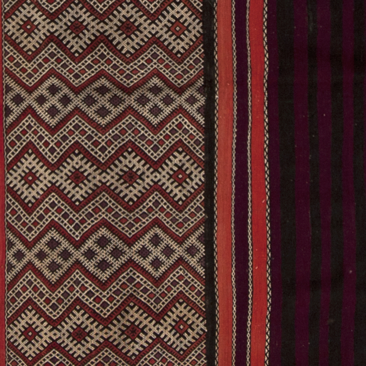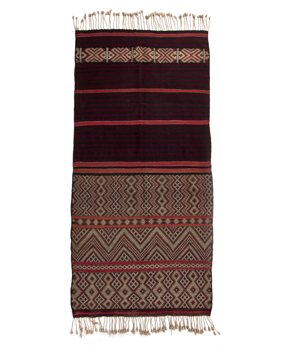 This tent band was designed and constructed by the Berber People of the Kingdom of Morocco. It is woven with a classic, “Berber Knot,” and features an extremely high thread count. Stylistically, rather than the flora and arabesque-like designs characteristic of other textile traditions, Berber rug patterns are “exclusively in straight lines, illustrating simple, geometric forms such as triangles, rectangles, zig-zags, stars and crosses…” (Barbatti 2008). This tent band or curtain serves a decorative and protective purpose. Affixed to the body of the tent, it can be raised during the day to admit light and air, or lowered over the stretchers for warmth and privacy. In this piece, there are diagonal shapes that lead the eye outward into a limitless space. The process of stylizing and preserving the form of such textiles require a deep knowledge of craft as transmitted via oral tradition through centuries in Berber culture.