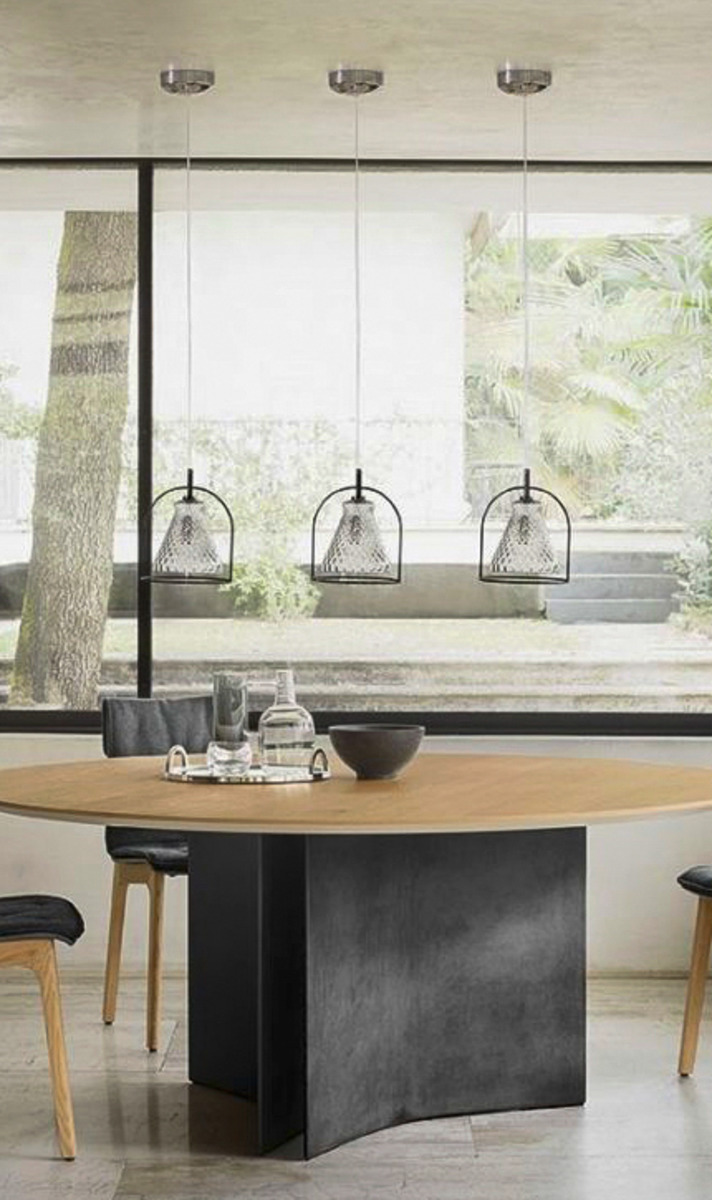 The Funky Collection of pendant lamps comes in a variety of shades, from transparent glass to light diffusing glass to decorative blown glass. The arched metal structure adds a modern and elegant look. This collection integrates perfectly with counters and tables.