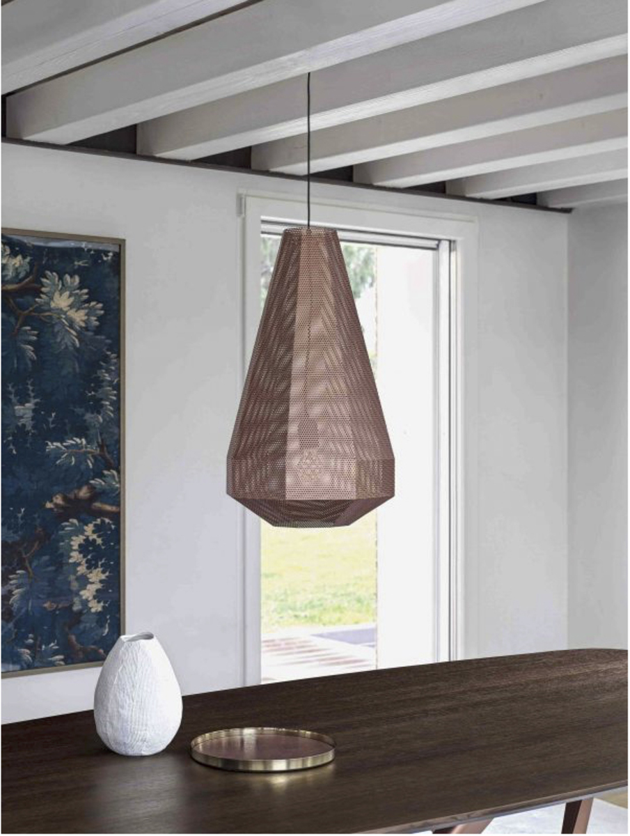 Pandora is a special light that not only illuminates a space, but is also a striking geometric object, even when turned off. The perforated metal shade is available in a wide range of lacquers to match the mood of your environment.