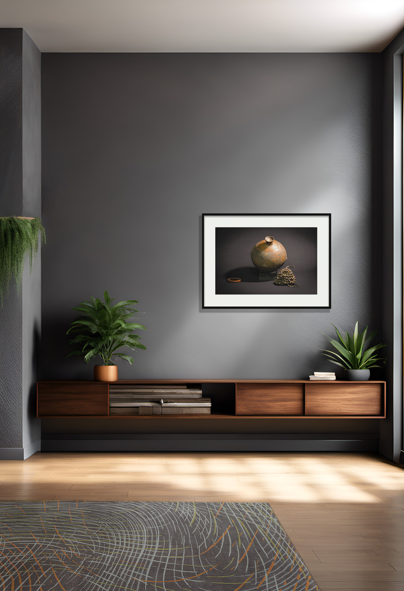 Emerging from soft shadows, this understated collection highlights three African objects in subtle repose. We see a circle, a sphere and a cone, each element essential to the overall harmony of the composition, yet each unique in form and materials. Together they act like friends from different points of origin, distinctive in character and temperament, yet in this moment, coming together to create a tranquil, agreeably balanced whole.