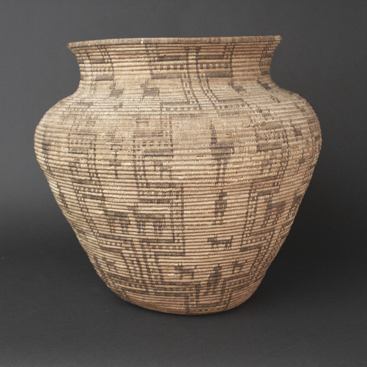 A work of profound cultural expression and technical virtuosity, this monumental Apache Ola basket—woven in the waning decades of the 19th century—embodies the spiritual and utilitarian heritage of the Western Apache people of the Southwest. This exceptional example of coiled basketry, rare in both scale and preservation, features a bold flaring shoulder, gently everted rim, and a remarkably harmonious contour. The basket’s interior reveals a radiating quatrefoil rosette at the base, symbolizing harmony and cardinal balance—an element often reserved for ceremonial or highly prized domestic wares.
