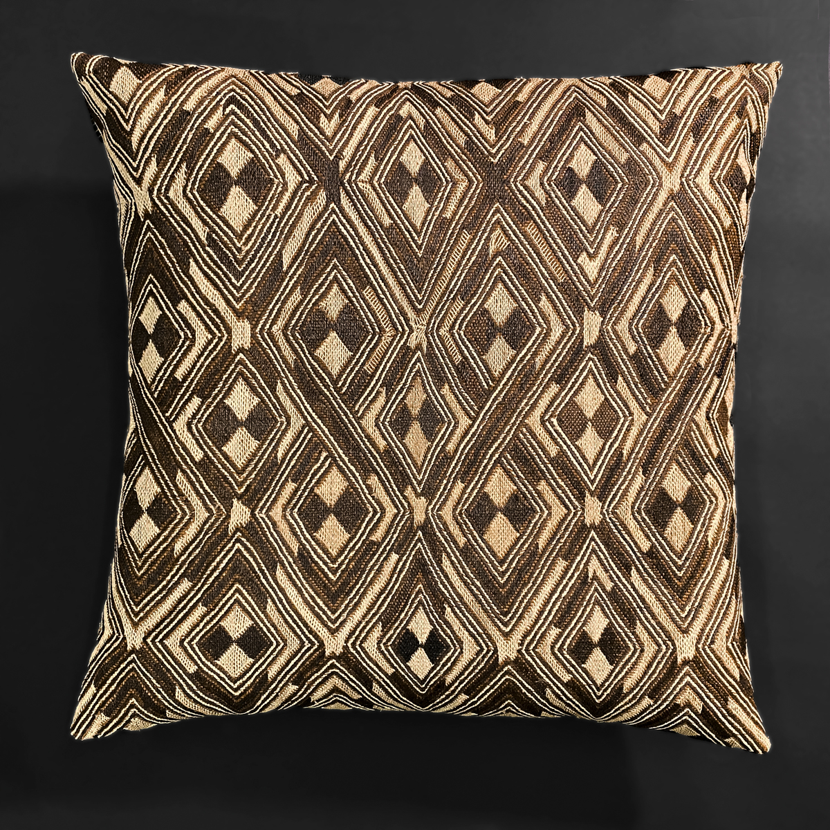 Refined in its graphic restraint and rich in cultural resonance, the “Echo Lines” Raffia Pillow showcases a dynamic nested diamond motif—an iconic symbol of the Kuba people’s mastery of abstraction, symmetry, and spiritual design. Handwoven and embroidered in the Kasai region of the Democratic Republic of Congo, this piece reflects centuries of Kuba textile innovation, where pattern becomes narrative and structure becomes soul.
