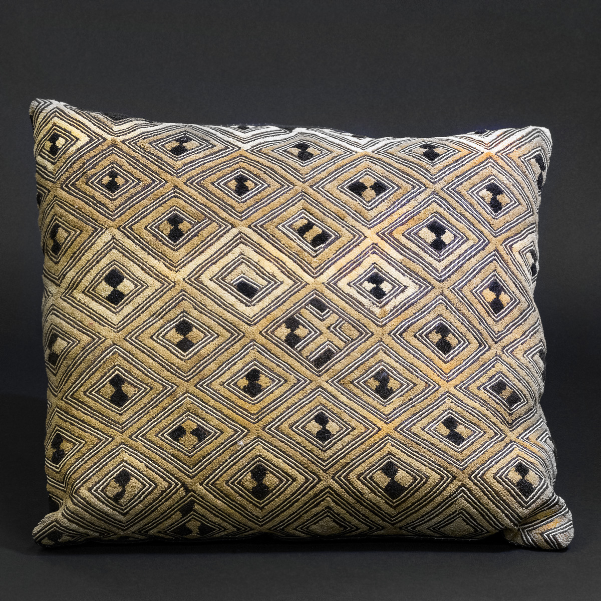 An elegant fusion of symmetry and storytelling, the “Guardians of the Grid” Raffia Pillow is a compelling example of Kuba textile mastery—its surface alive with geometric tension, rhythm, and ancestral symbolism. Handwoven and embroidered by artisans of the Kuba Kingdom in the Democratic Republic of Congo, this piece showcases a field of concentric diamond medallions (ikula), each enclosing a central dot or cross, representing spiritual vision and protective energy.