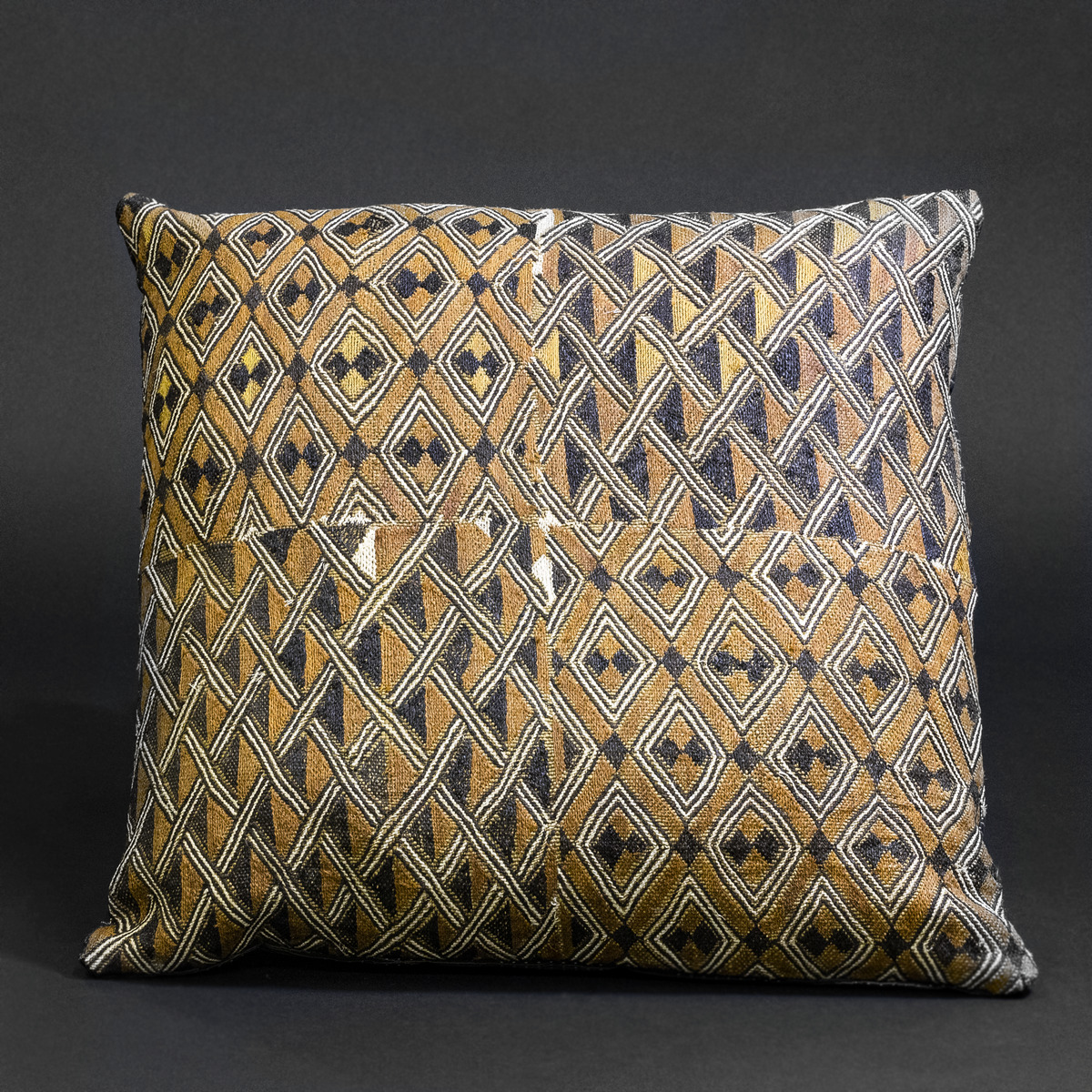 “Patterned Lineage” — Kuba Patchwork Raffia Pillow with Diamond and Interlace Motifs, D.R. Congo