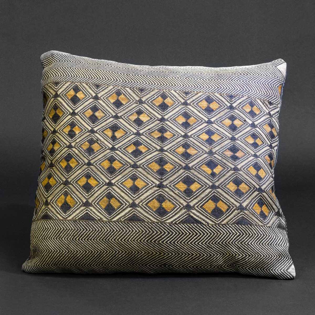 The alternating diamond forms—referred to in Kuba symbolism as ikula—evoke notions of fertility, wisdom, and continuity. Their geometric repetition reflects a cosmological worldview where structure and rhythm guide human and spiritual life. Framed above and below by fine zigzag bands (liyelele), this pillow visually references protective boundaries—commonly interpreted as shields against chaos or malevolent forces.