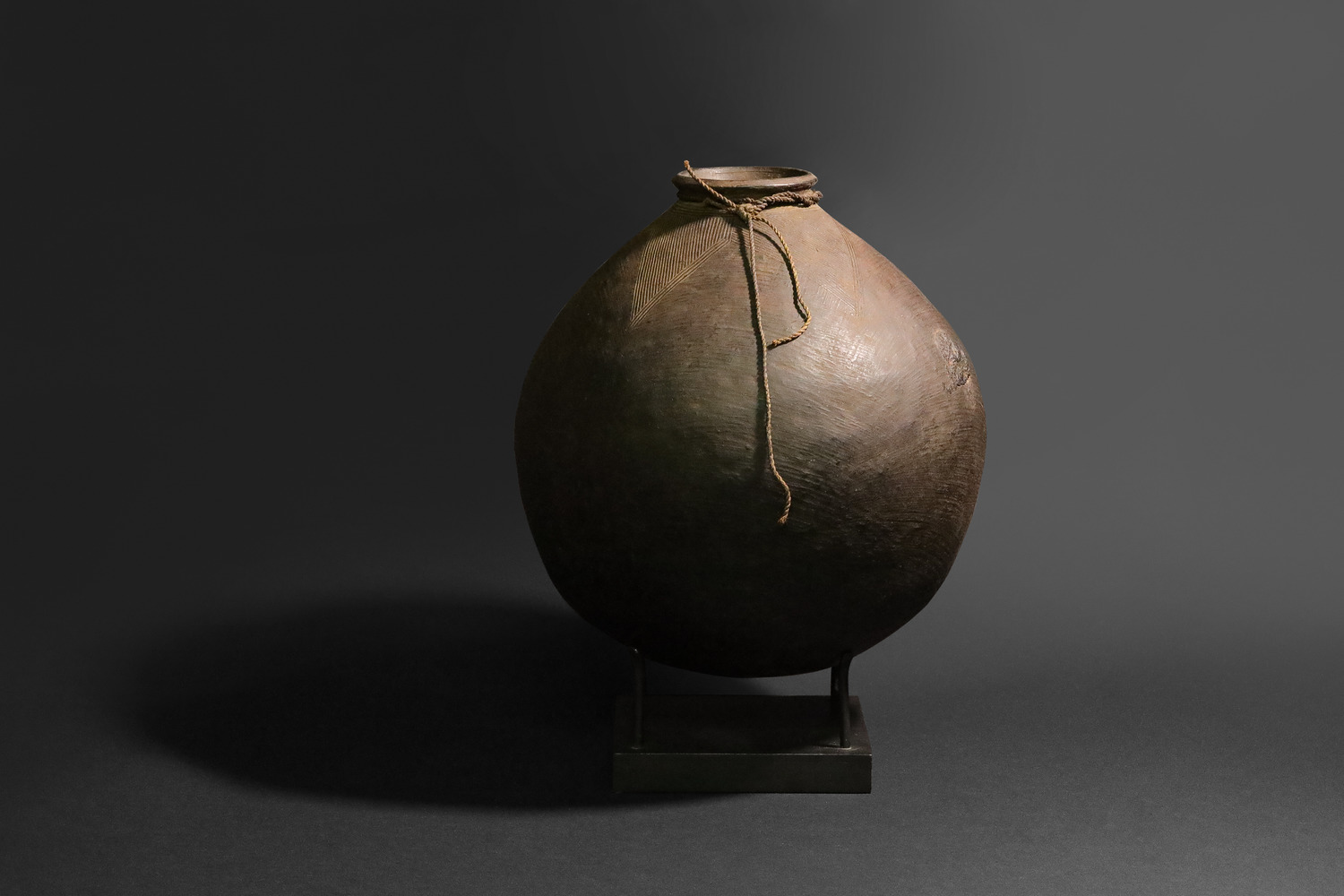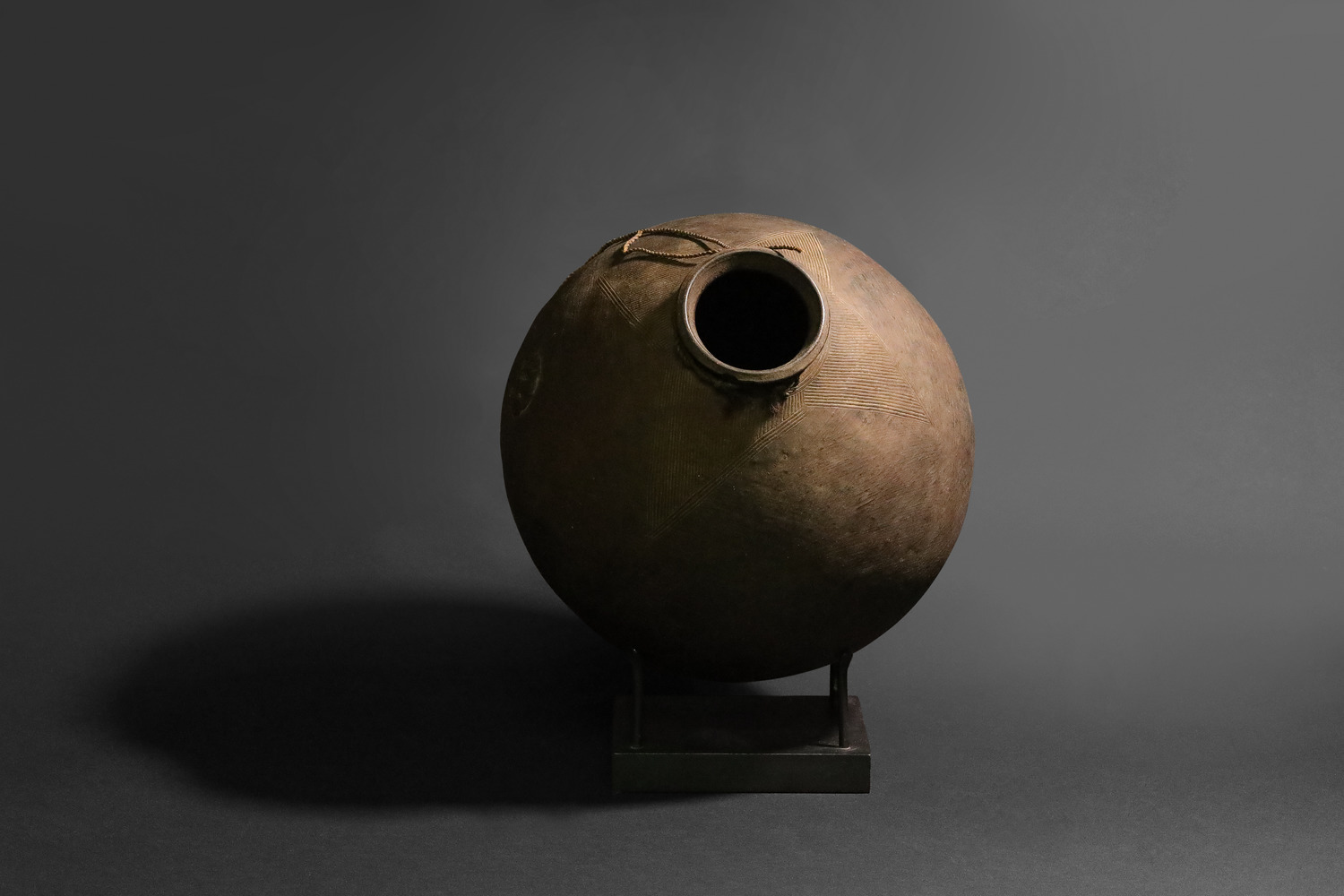 This striking vessel is hand molded from terra-cotta clay by the Batwa (Pygmy) People from Burundi. It is marked by a large, beveled lip on top, around which lies a four-pointed star comprised of diagonal striations that function both aesthetically and to facilitate a hand grip while pouring or drinking. With a surface structure that is delicately textured, this vessel is employed for consumption of local wine in domestic contexts and during various cultural ceremonies. Bushera pots have a rounded body and a flat base that makes them stable for use. They often have a narrow opening at the top, which can be covered with a lid. The Batwa people use natural materials such as clay and cow dung to create their pots, giving them a rustic, earthy appearance that is in keeping with the Batwa’s close connection to the land and nature.