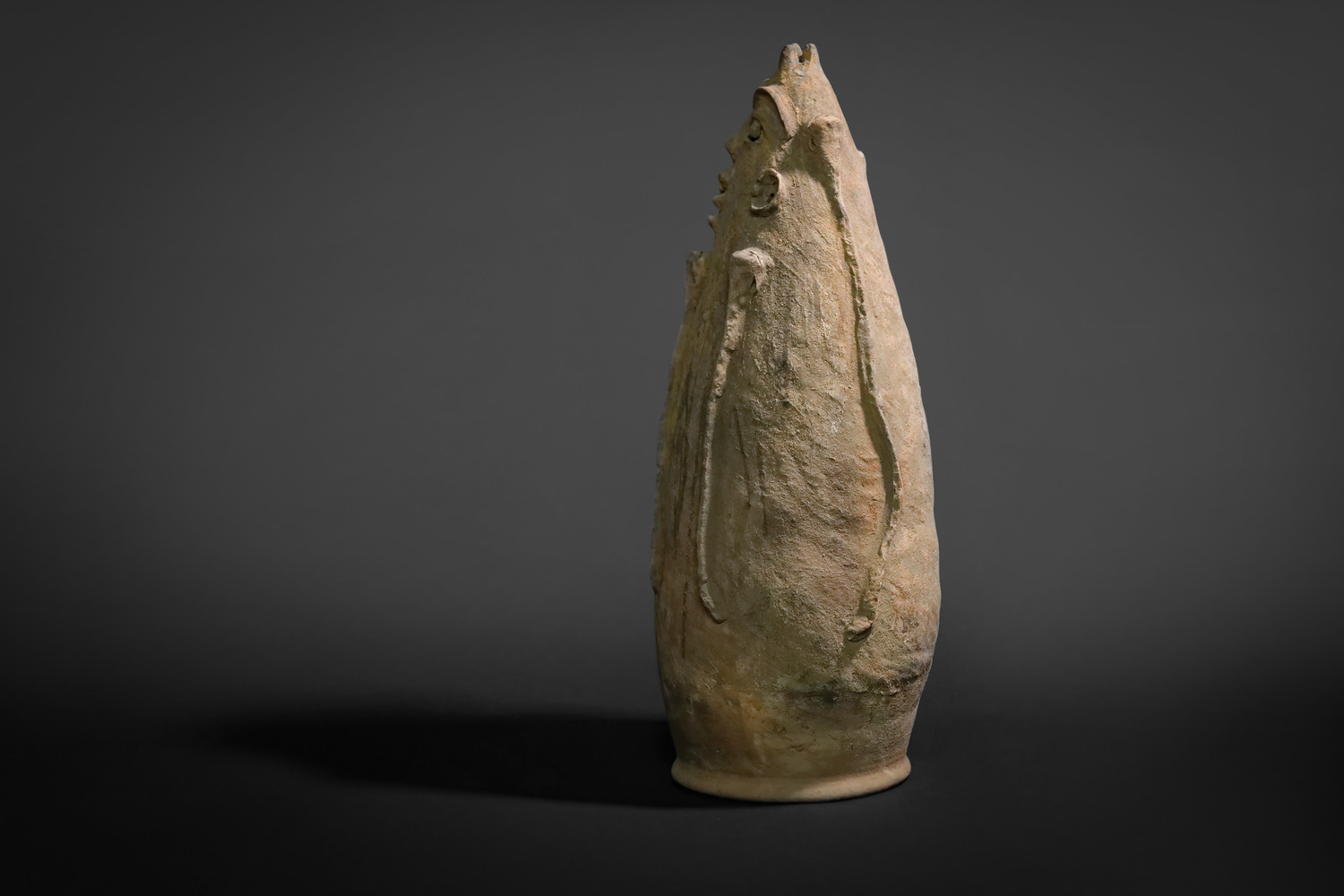 This religious statue is designed and hand built of terra-cotta clay by the Akan People of the Republic of Ghana. It functions as a spiritual guardian within the Akan belief system, by conveying a foreboding appearance, with two gapped teeth, protruding ears, and three vertical horns forming a crown. Unlike other African pottery described in these pages, this object is virtually solid, and as such is not intended to contain liquids but rather serve as an object of deep, spiritual reverence. Akan cosmology consists of a senior God who generally does not interact with humans but rather via a medium such as this figure.
