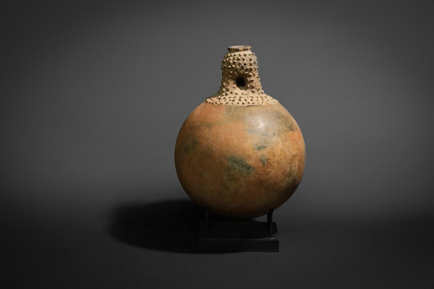 The head of this pot features a single opening, which is sculpted into three curved channels that connect with the body of the pot. Resembling the extending arms of an octopus, the top is decorated with raised bumps that are both aesthetic and function as a firm, hand grip while holding. The body of the vessel features a beautiful, orange, Mars-like patina accrued over decades of daily use. It is designed to contain liquids such as beer, oil, water or palm wine. Such pieces are additionally employed to honor one’s ancestors ritualistically or to place on appropriate shrines.