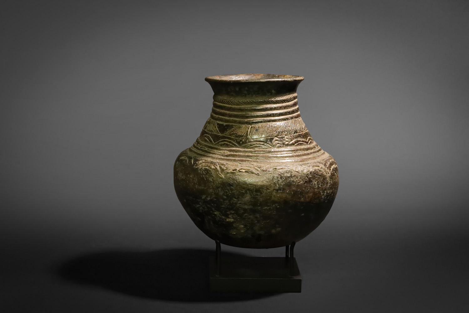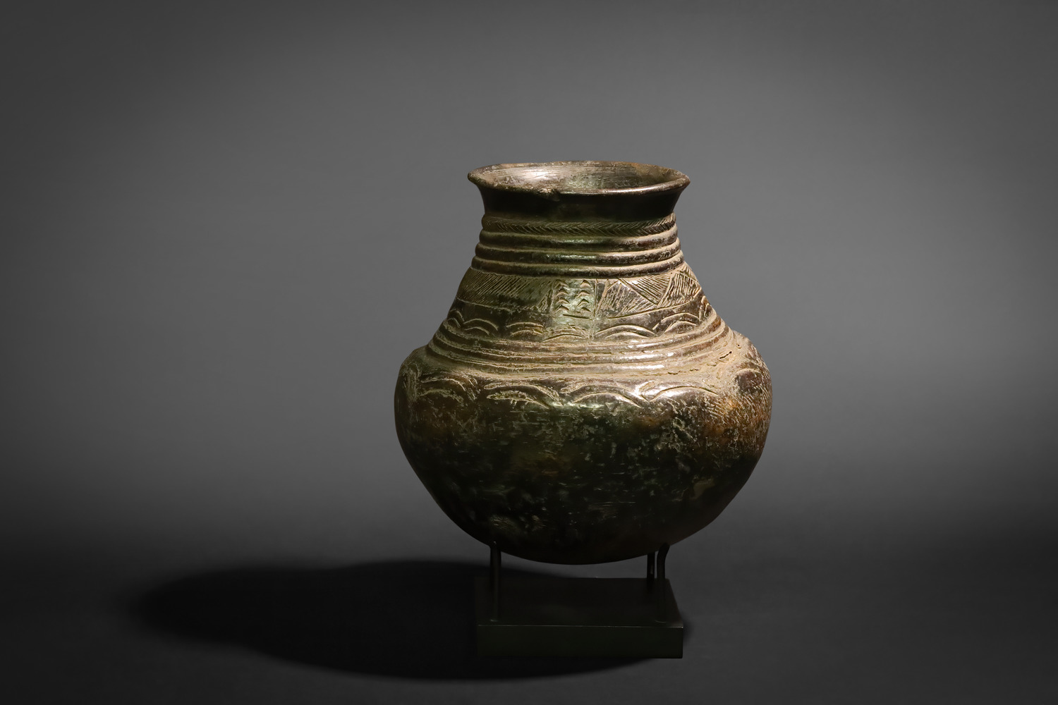 This lyrically decorated vessel is hand crafted from terracotta clay by the Songye People of the Republic of Congo. It features a protruding lip and beveled rings, alternating with a series of striated arcs and triangles, which loosely resemble waves of water and mountains. Small vessels such as this are prevalent throughout Central Africa, and are designed to contain liquids such as beer, oil, water or palm wine. These pieces are additionally employed to honor one’s ancestors ritualistically, or to place on appropriate shrines.