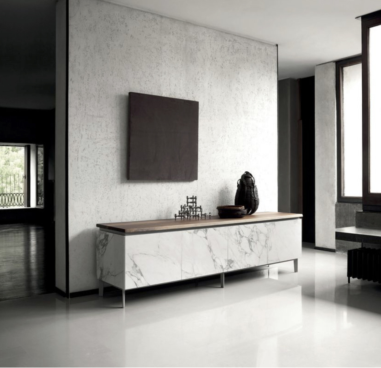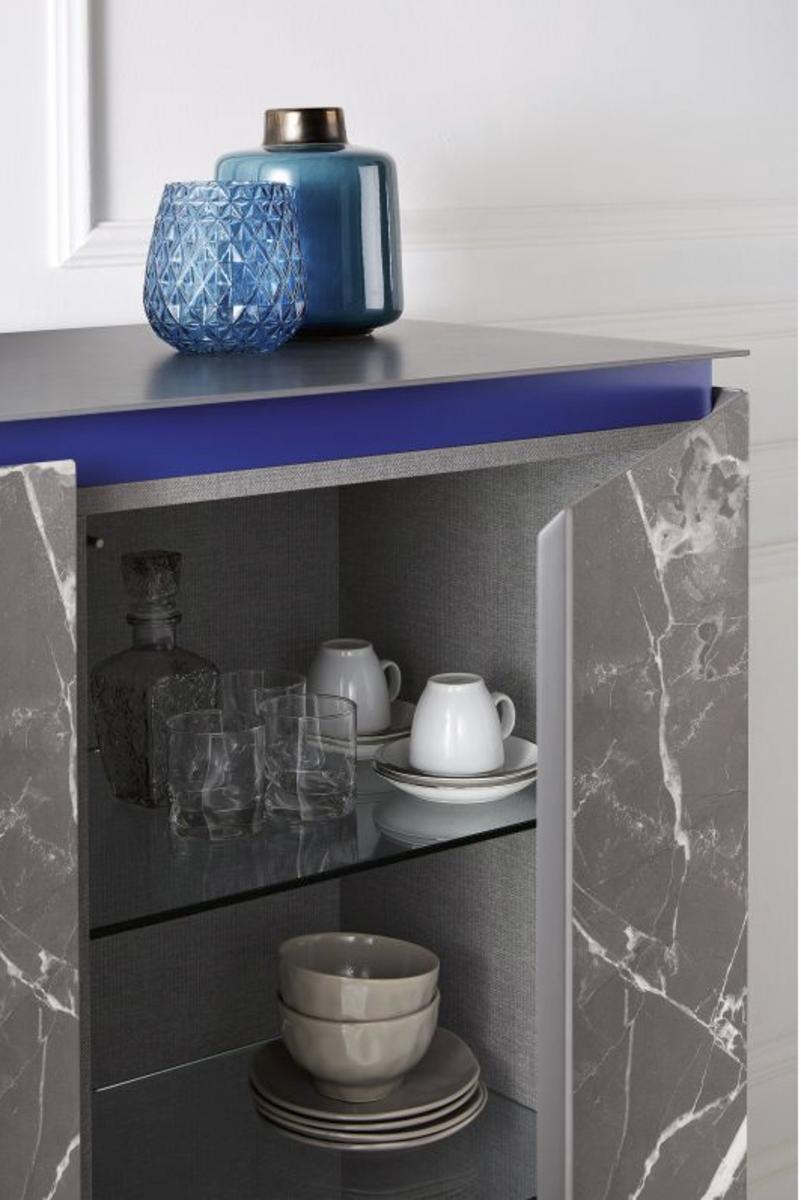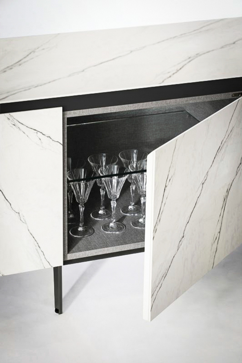 Featuring sleek surfaces and minimal lines, this Cosmopolitan sideboard is designed for environments of simple elegance and modern sensibility. Available in many configurations, the piece is customizable with various materials and finishes. Also available in a lacquered, hardwood version with any NCS/RAL color. Top, frontal and side panels rendered in velvet matte and anti-scratch, lacquered glass.