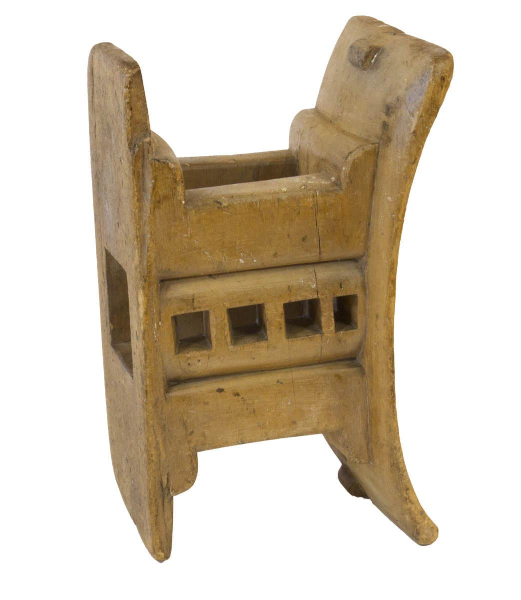 The Ashanti People of West Africa originated from the Empire by the same name and presently inhabit the southern region of the Republic of Ghana. These unique stools are hand carved from a single, hardwood block of the “sese” or “tweneboa” tree. Within Ashanti culture, this stool is perceived as a universal icon of power, achievement, and authority. It is also a vehicle for memory of the bearer’s cultural lineage (“Kingdom of Ashante” 2017). By cultural tradition, the trees chosen for carving are rendered praise through special ceremonies – to bless the wood and offer reverence for nature’s sacrifice. The seat of an Ashanti stool curves upward on either side, both to physically embrace its user and symbolically furnish refuge for the soul. Carved etchings and motifs representing achievements of its owner adorn the surface and edges of the stools. Occasionally, tree rings are clearly visible on the surface of the object, contributing to its physical beauty.