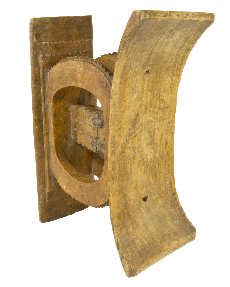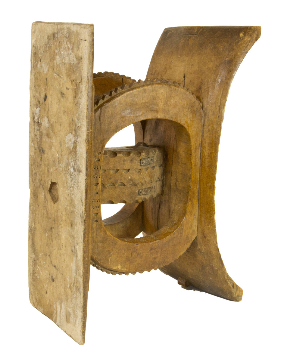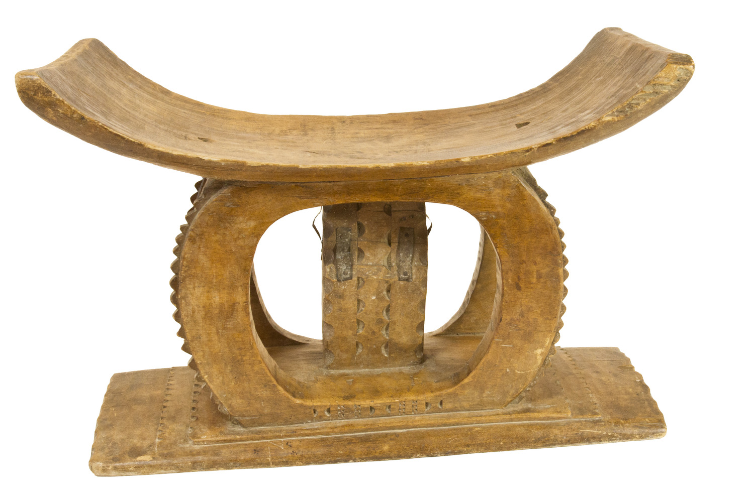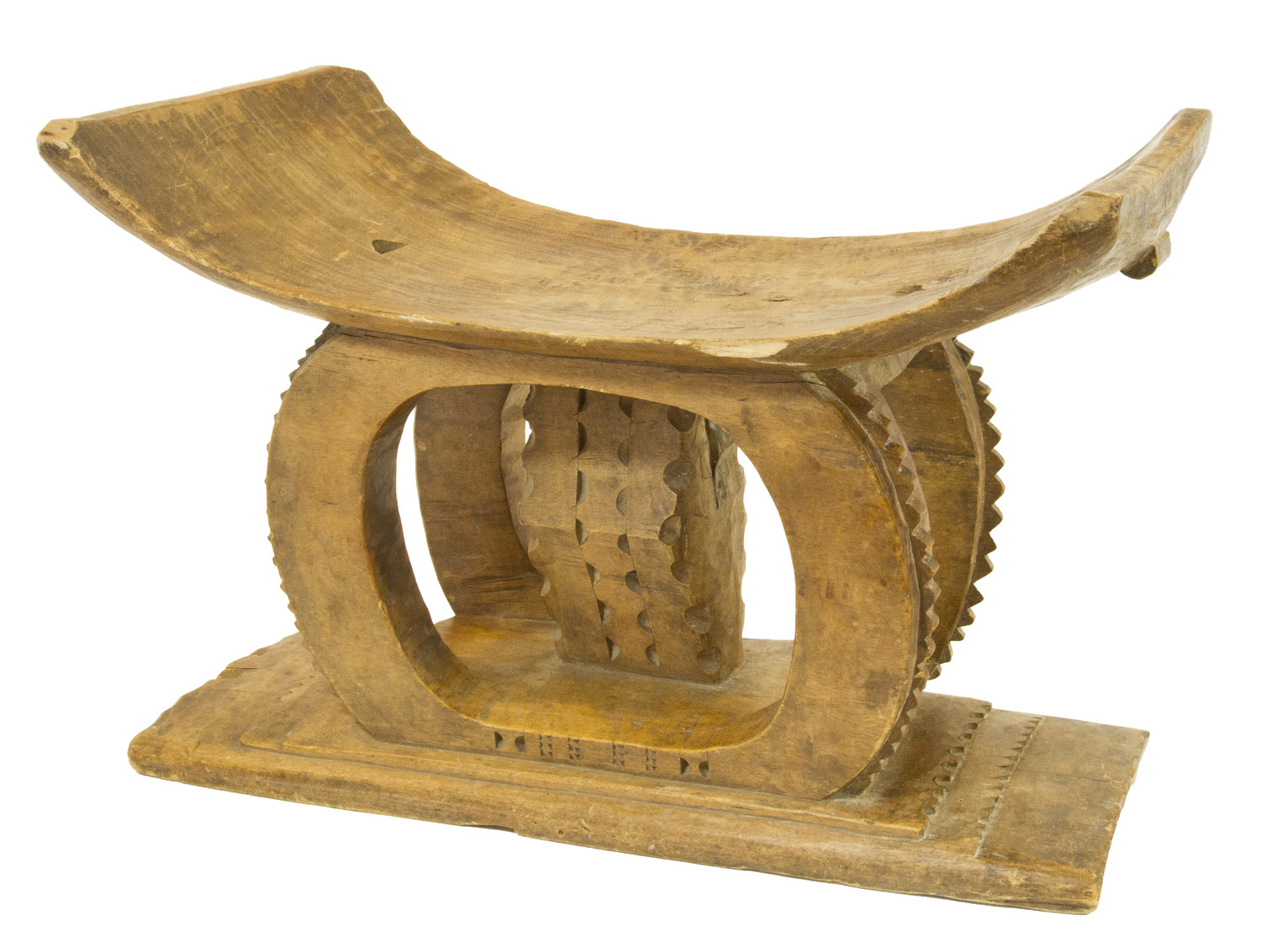 The Ashanti People of West Africa originated from the Empire by the same name and presently inhabit the southern region of the Republic of Ghana. These unique stools are hand carved from a single, hardwood block of the “sese” or “tweneboa” tree. Within Ashanti culture, this stool is perceived as a universal icon of power, achievement, and authority. It is also a vehicle for memory of the bearer’s cultural lineage (“Kingdom of Ashante” 2017). By cultural tradition, the trees chosen for carving are rendered praise through special ceremonies – to bless the wood and offer reverence for nature’s sacrifice. The seat of an Ashanti stool curves upward on either side, both to physically embrace its user and symbolically furnish refuge for the soul. Carved etchings and motifs representing achievements of its owner adorn the surface and edges of the stools. Occasionally, tree rings are clearly visible on the surface of the object, contributing to its physical beauty.