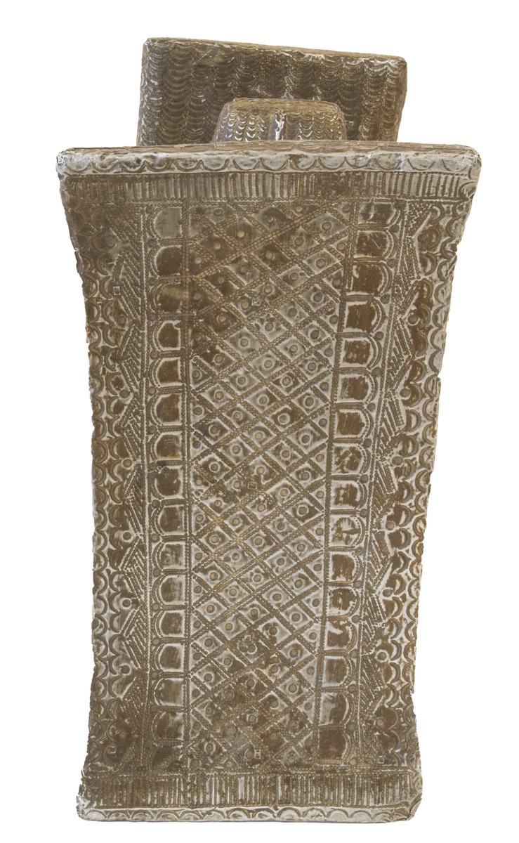 The Ashanti People of West Africa originated from the Empire by the same name and presently inhabit the southern region of the Republic of Ghana. These unique stools are hand carved from a single, hardwood block of the “sese” or “tweneboa” tree, then hammered with embossed, silver clad.