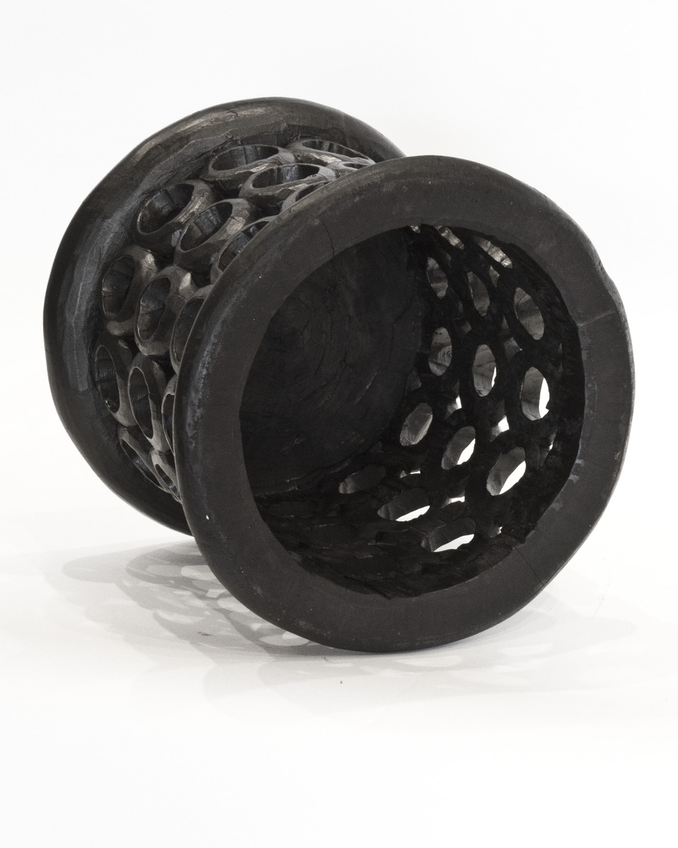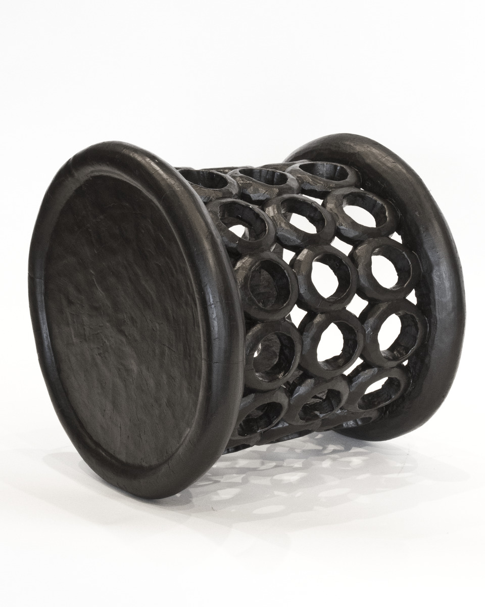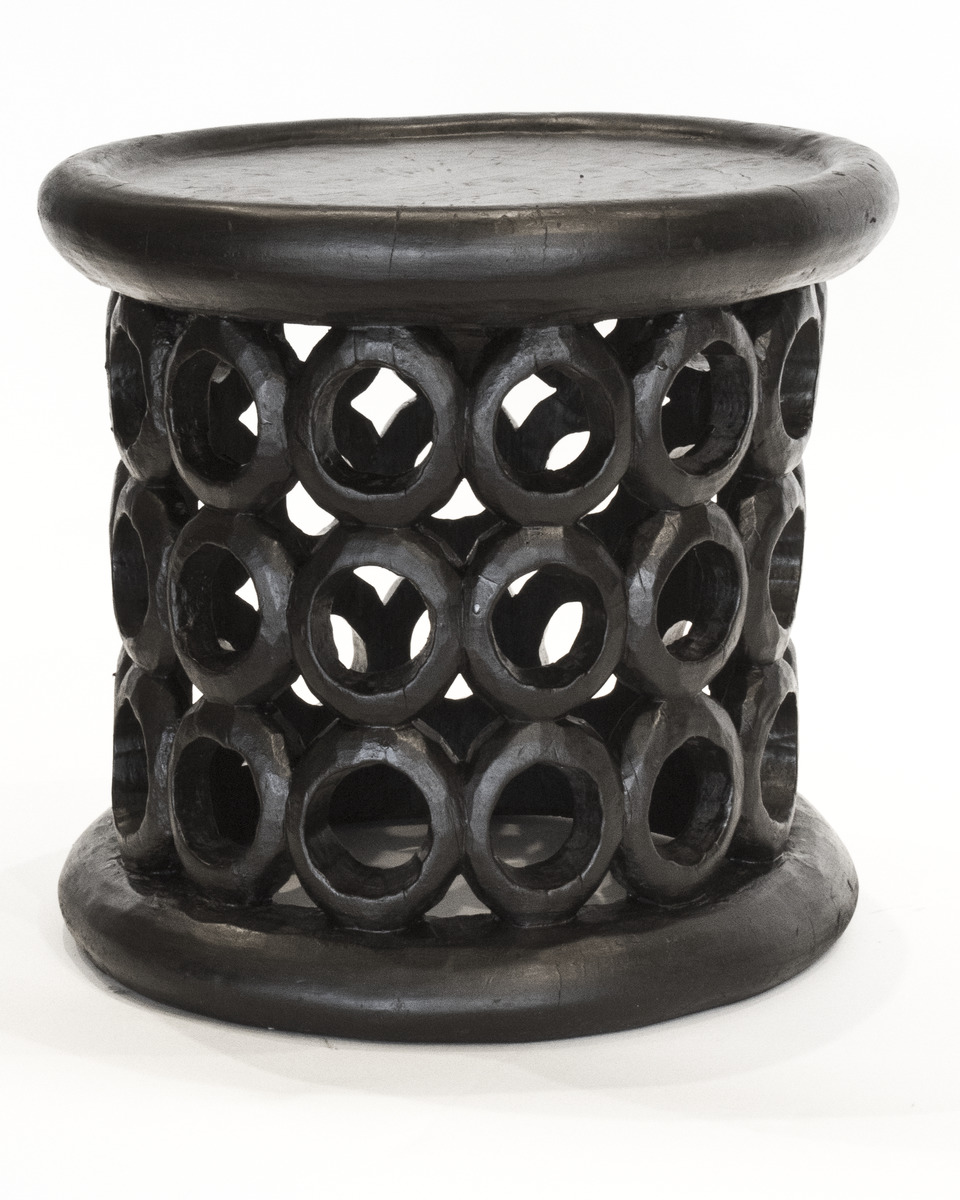 The West Region of Cameroon is home to the Bamileke, a grassfields people who speak one or several of the eleven languages native to this area. These unique “Spider Stools” are hand carved from a single, hardwood block (trunk) of the coffee shade tree local to this geography. These specific objects are built by the Bamoun, a Royal Family within Bamileke culture. The material for these Spider Stools is delivered to the Family at the request of local farmers, who donate the coffee shade trees when they become overgrown. By Bamileke tradition, the precise pattern of these Stools embody, iconically, the origins of life, whereby it was the female spider that wove the web, which in turn, “captured” creation. The spider is utilized both physically in design and metaphorically in spirit; while burrowing into the ground, the spider serves as the link between the living world and the afterlife. These Stools were employed by nobility and those seeking audience in royal circles. Due to the expansive Kingdom of the Bamileke, its craftsmen rendered these stools transportable so they could be hand carried from one village to another.