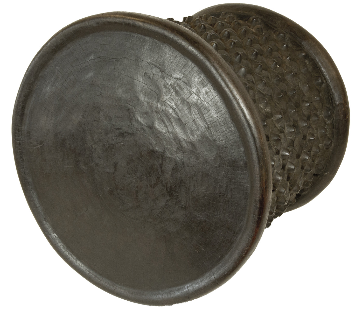 The West Region of Cameroon is home to the Bamileke, a grassfields people who speak one or several of the eleven languages native to this area. These unique “Spider Stools” are hand carved from a single, hardwood block (trunk) of the coffee shade tree local to this geography. These specific objects are built by the Bamoun, a Royal Family within Bamileke culture. The material for these Spider Stools is delivered to the Family at the request of local farmers, who donate the coffee shade trees when they become overgrown. By Bamileke tradition, the precise pattern of these Stools embody, iconically, the origins of life, whereby it was the female spider that wove the web, which in turn, “captured” creation. The spider is utilized both physically in design and metaphorically in spirit; while burrowing into the ground, the spider serves as the link between the living world and the afterlife. These Stools were employed by nobility and those seeking audience in royal circles. Due to the expansive Kingdom of the Bamileke, its craftsmen rendered these stools transportable so they could be hand carried from one village to another.