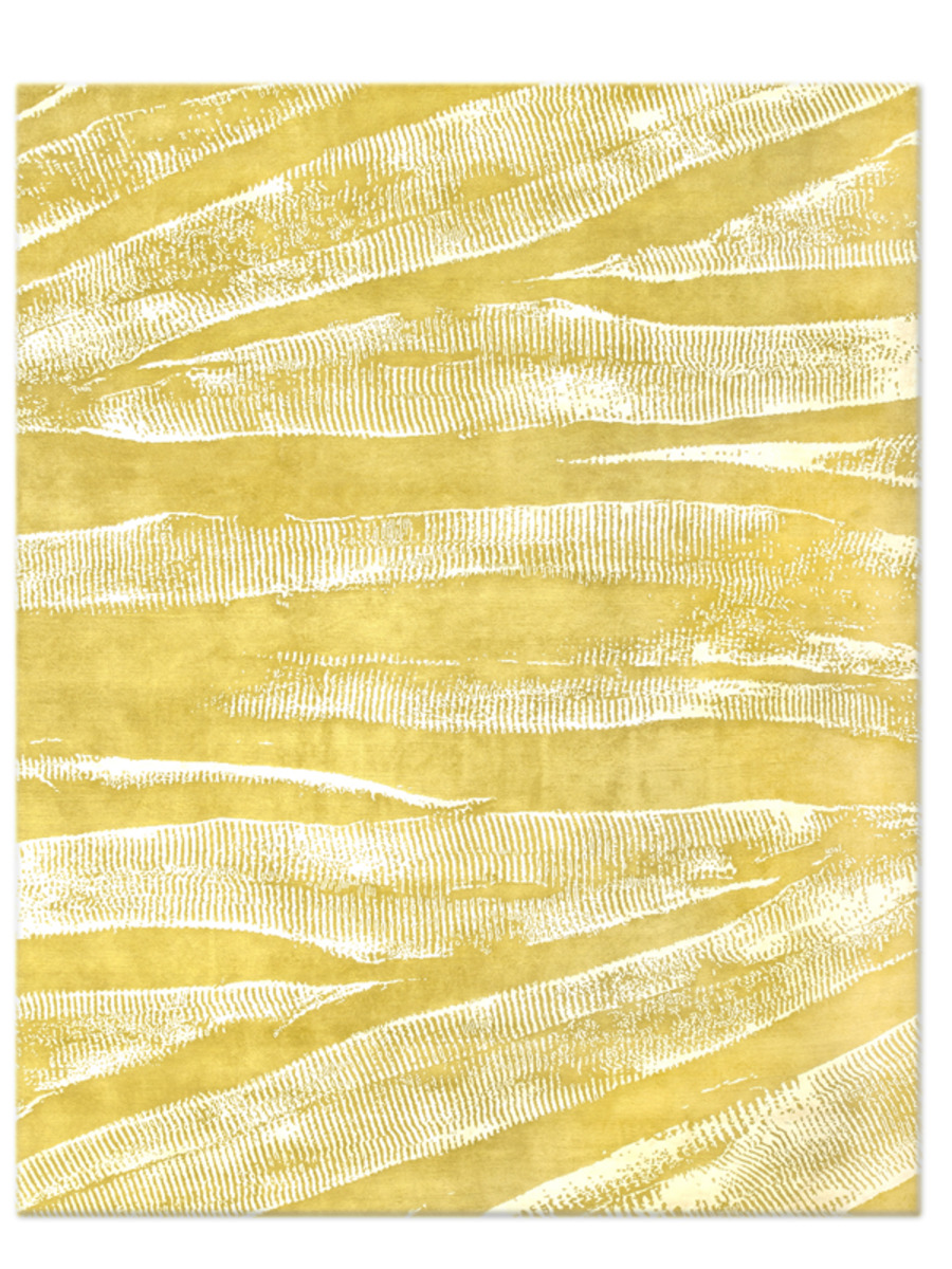 Designed by Fida Nehme and flowing with gentle geometry, Ebu references the rhythmic sand patterns made by ocean waves as the tide goes out. Realized here in gleaming white silk on matte yellow wool, its long organic shapes are both dramatic and subtle.