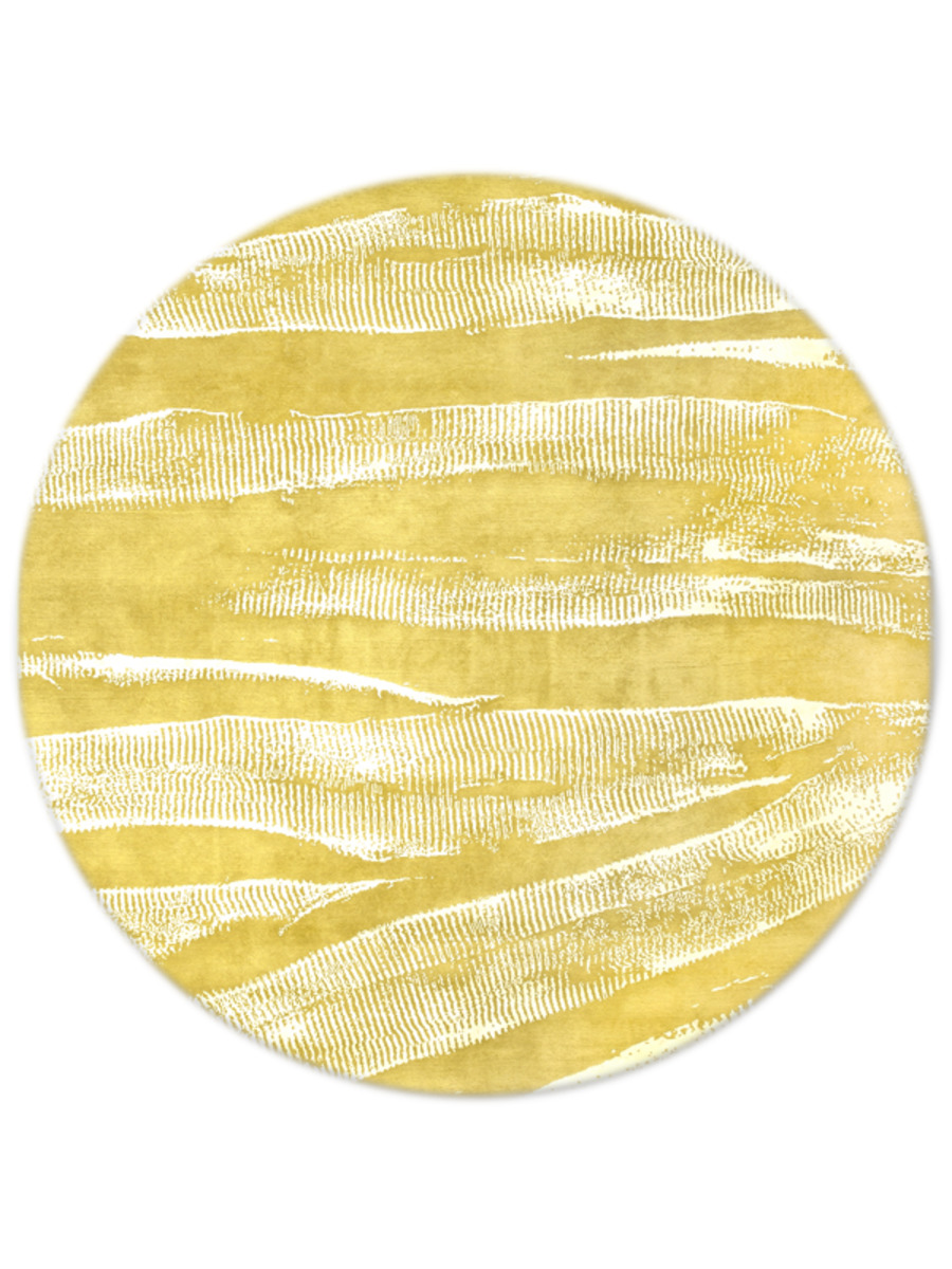 Designed by Fida Nehme and flowing with gentle geometry, Ebu references the rhythmic sand patterns made by ocean waves as the tide goes out. Realized here in gleaming white silk on matte yellow wool, its long organic shapes are both dramatic and subtle.