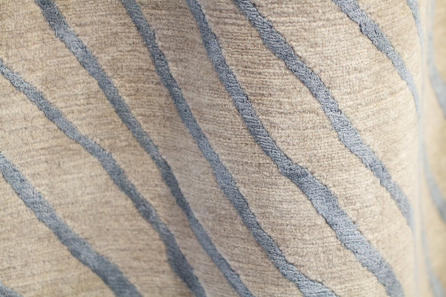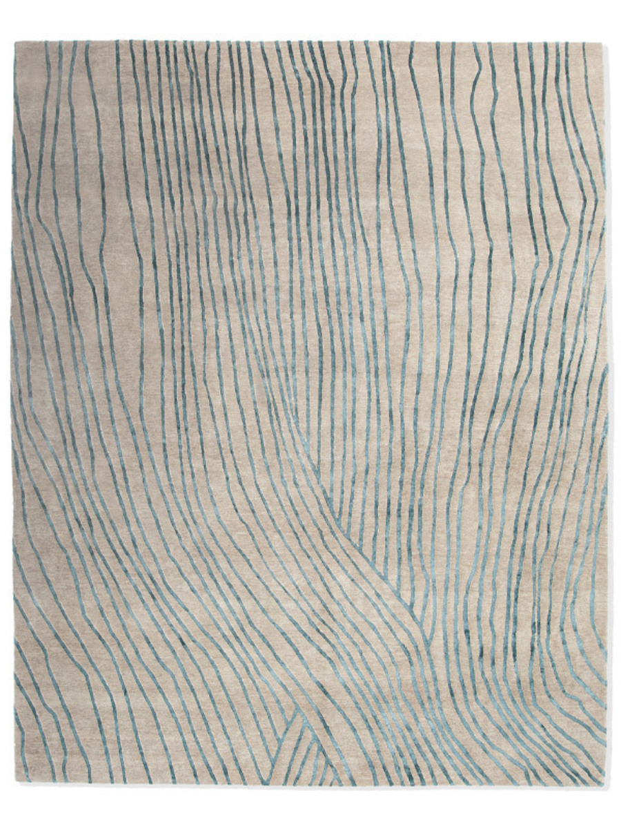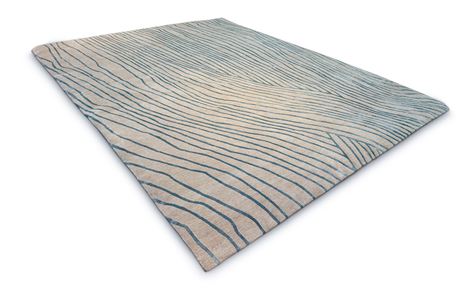 Abstracted and minimal in the style of Japanese woodcuts, the overlapping lines of “FURO” represent the endless meanderings of a flowing river. Designed by architect Fida Nehme in soft warm beige wool with shimmering lines of blue silk, “Furo” resonates with a languid energy, creating a space both tranquil and luxurious.