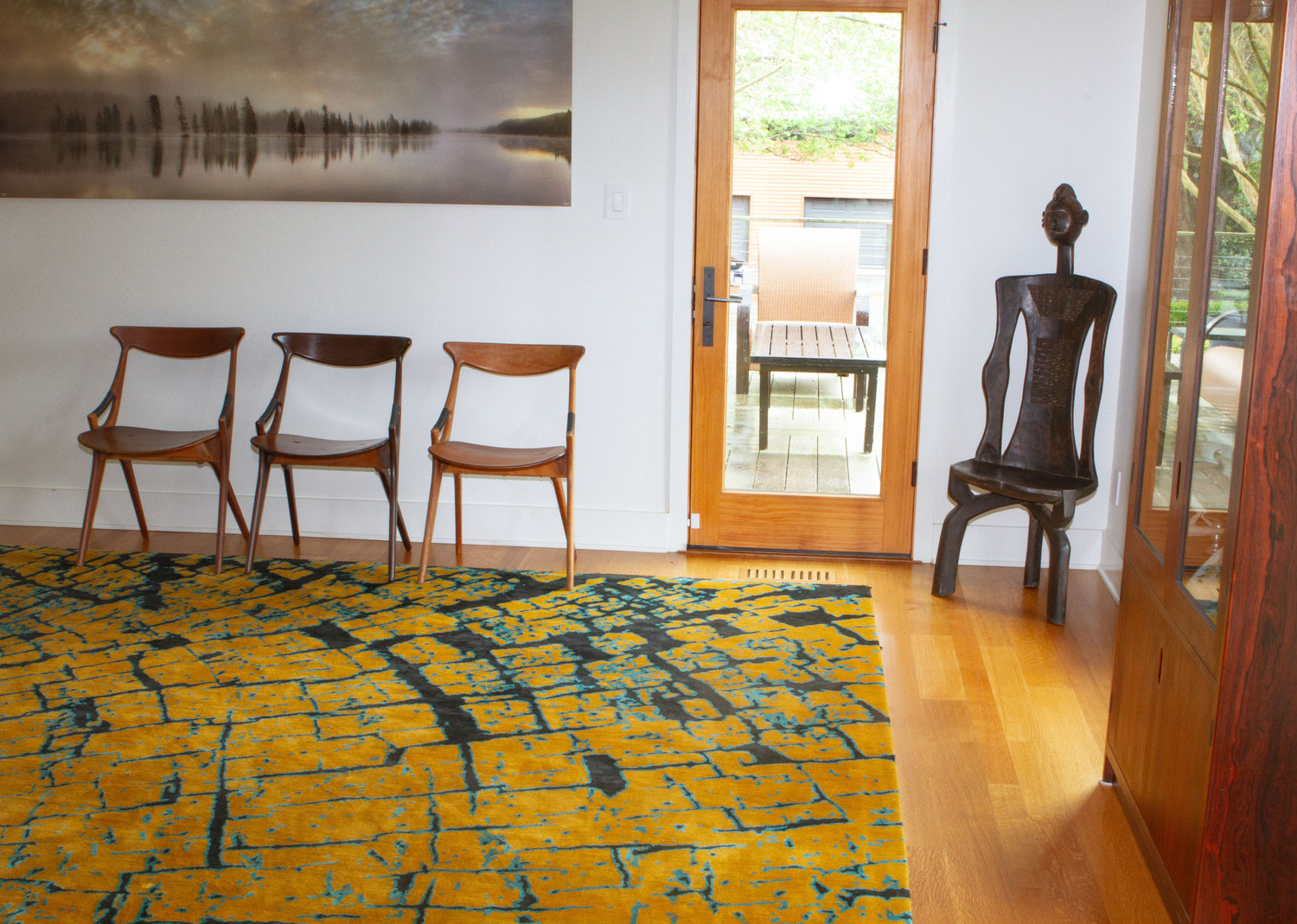 Designed by Fida Nehme, Tapa’s expansive curves resemble the growth patterns of a magical tree. The use of rich, deep colors create a feeling of walking in a mysterious forest at midnight. The use of silk adds a touch of luxury. Hand-knotted by our weavers using the Tibetan knot, this carpet is made from virgin New Zealand worsted wool and natural Mulberry silk. High density knotting, (121 knots per inch and above,) produces a clarity of shape and continuity of color not achievable through lower knot counts, (80 and below). We believe that “slow fashion”, made well with long-lasting materials and chosen with the future in mind is the obvious choice for us as responsible makers and you as aware consumers. Our carpets are modern heirlooms meant to last for generations.