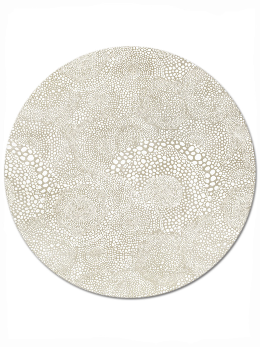 Designed by Fida Nehme, Utamaro’s complex overlapping patterns resemble delicate clusters of lichen as they slowly flow over an ancient stone. The use of cream colored silk adds a touch of lacy elegance.Hand-knotted by our weavers using the Tibetan knot, this carpet is made from virgin New Zealand worsted wool and natural Mulberry silk. High density knotting (121 knots per inch and above) produces a clarity of shape and continuity of color not achievable through lower knot counts (80 and below). We believe that “slow fashion”, made well with long-lasting materials and chosen with the future in mind is the obvious choice for us as responsible makers and you as aware consumers. Our carpets are modern heirlooms meant to last for generations.