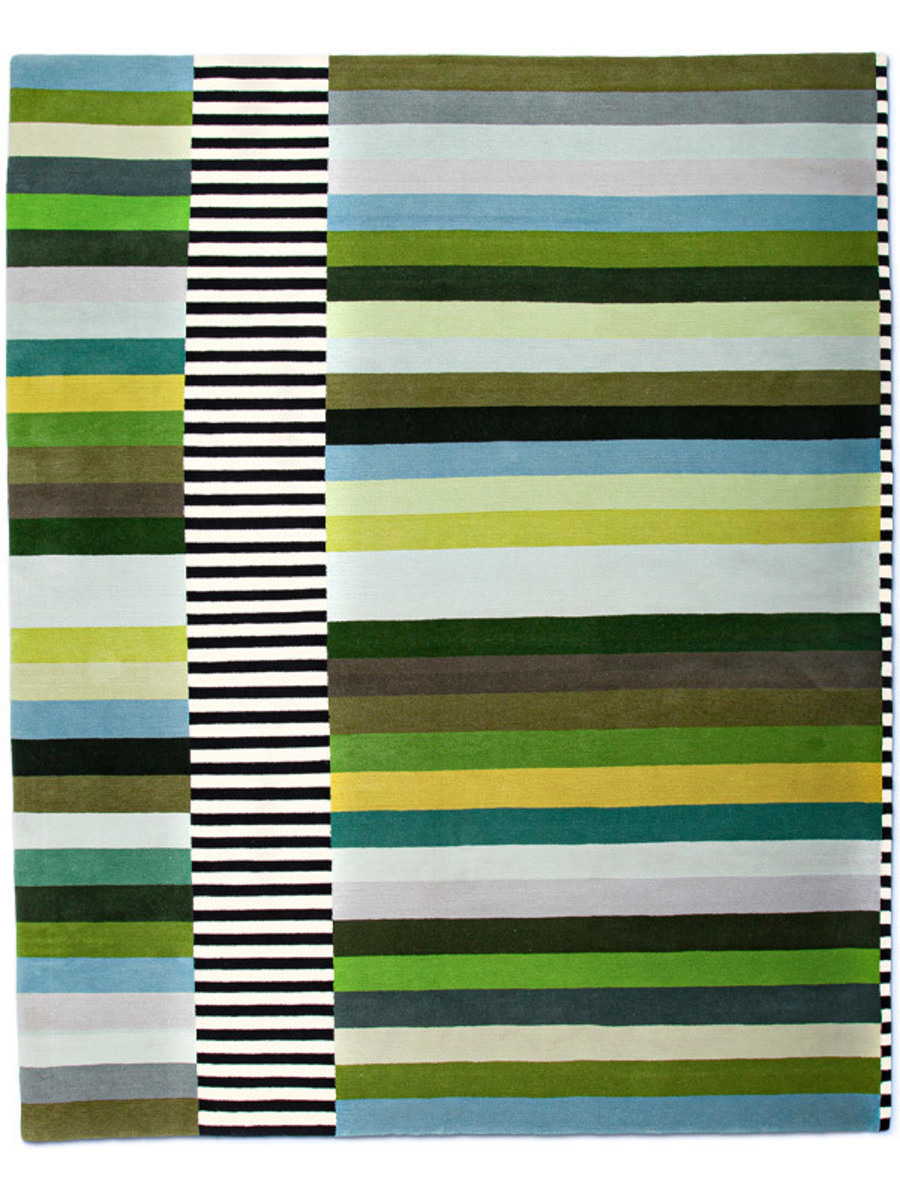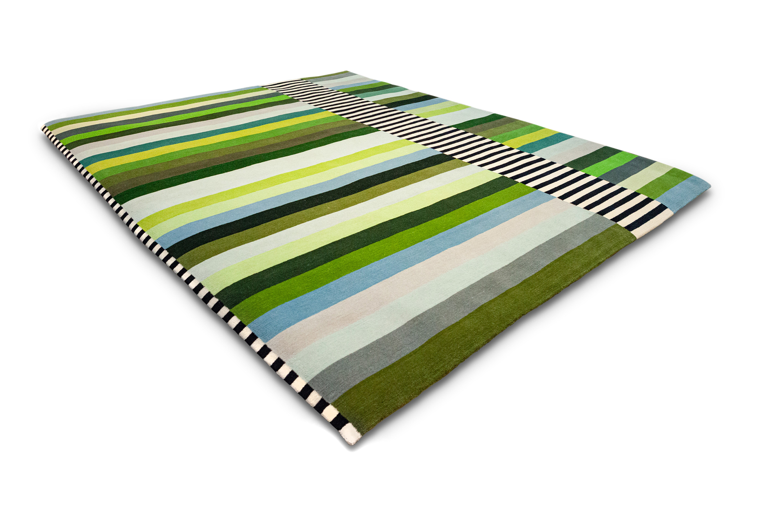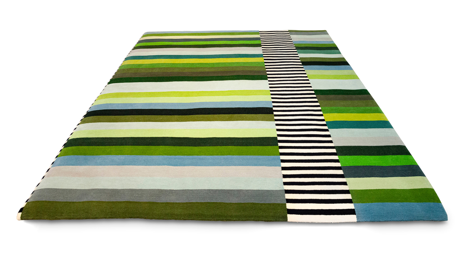 Fida Nehme’s “Prato” (with b/w) is a pair of perpendicular systems. The optical black and white stripes reference an urban crosswalk, while the opposing photosynthetic bands of living color feel like a happy science experiment: one in which everything grows. With its long rhythmic lines and vibrant cool colors, Prato generates a sense of sustained ecological energy.