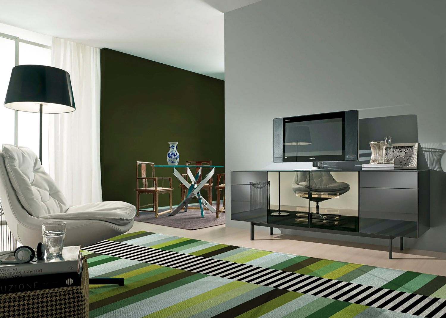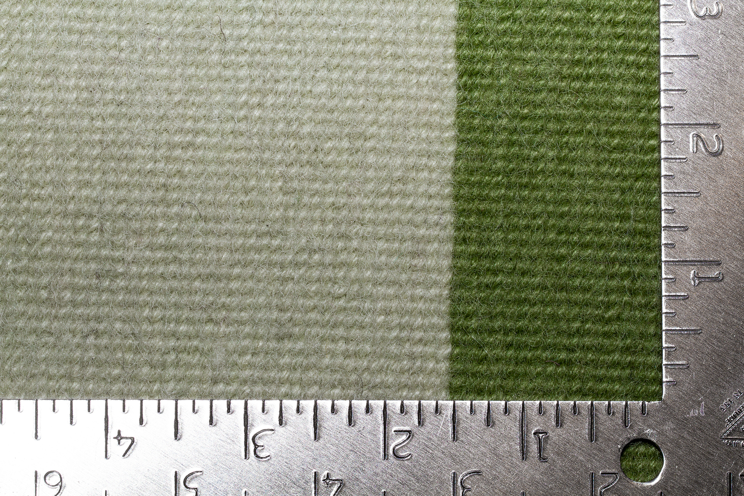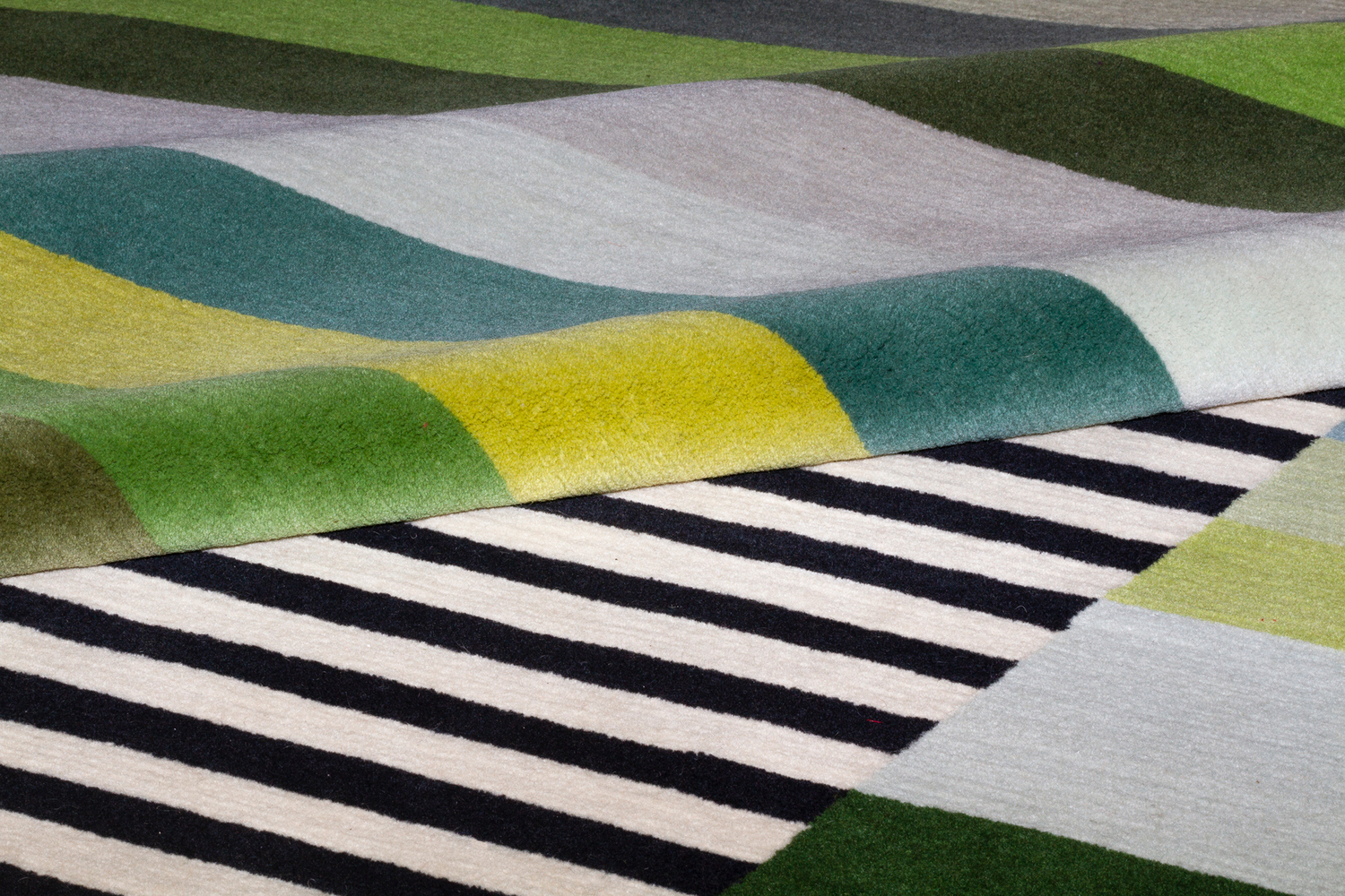 Fida Nehme’s “Prato” (with b/w) is a pair of perpendicular systems. The optical black and white stripes reference an urban crosswalk, while the opposing photosynthetic bands of living color feel like a happy science experiment: one in which everything grows. With its long rhythmic lines and vibrant cool colors, Prato generates a sense of sustained ecological energy.