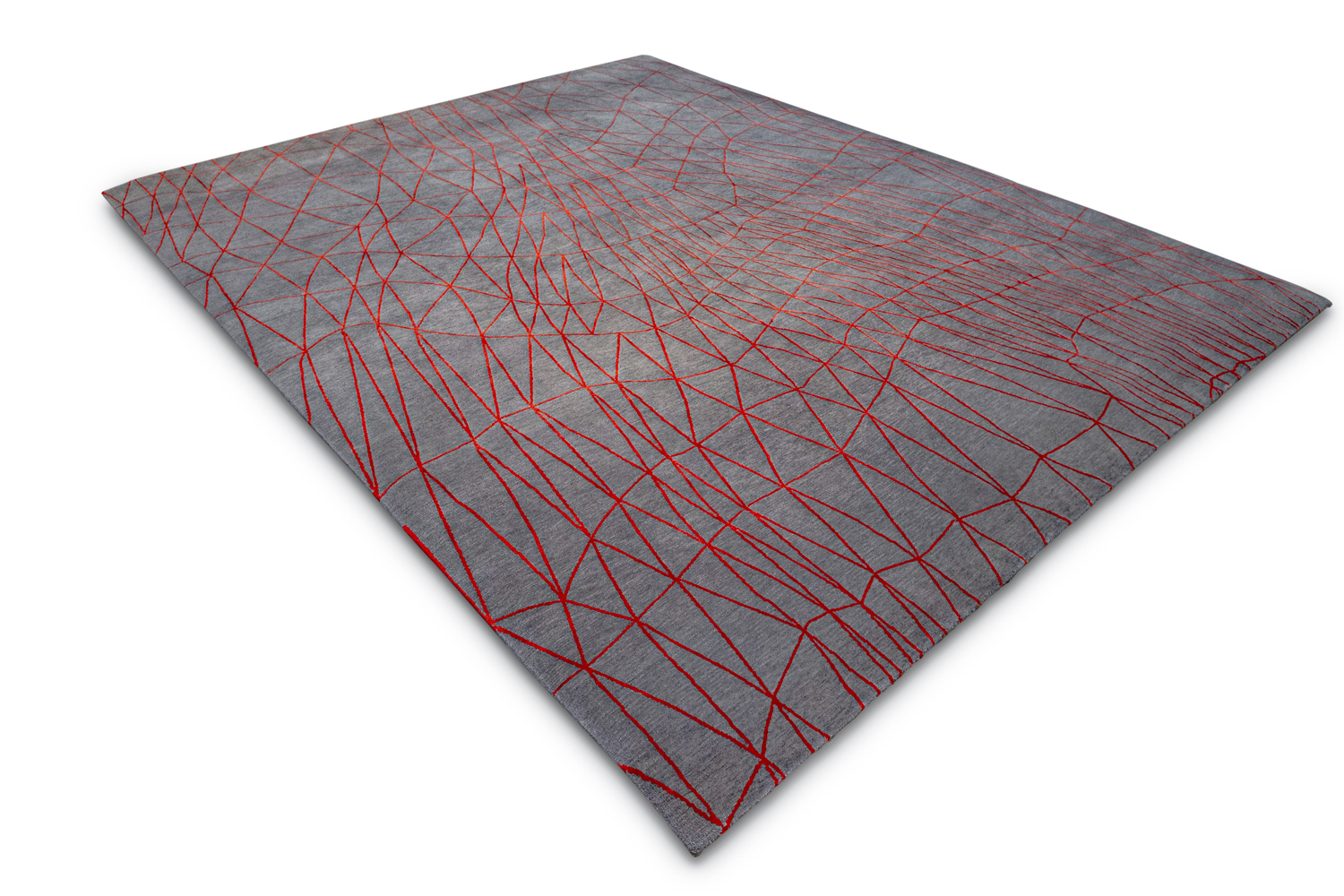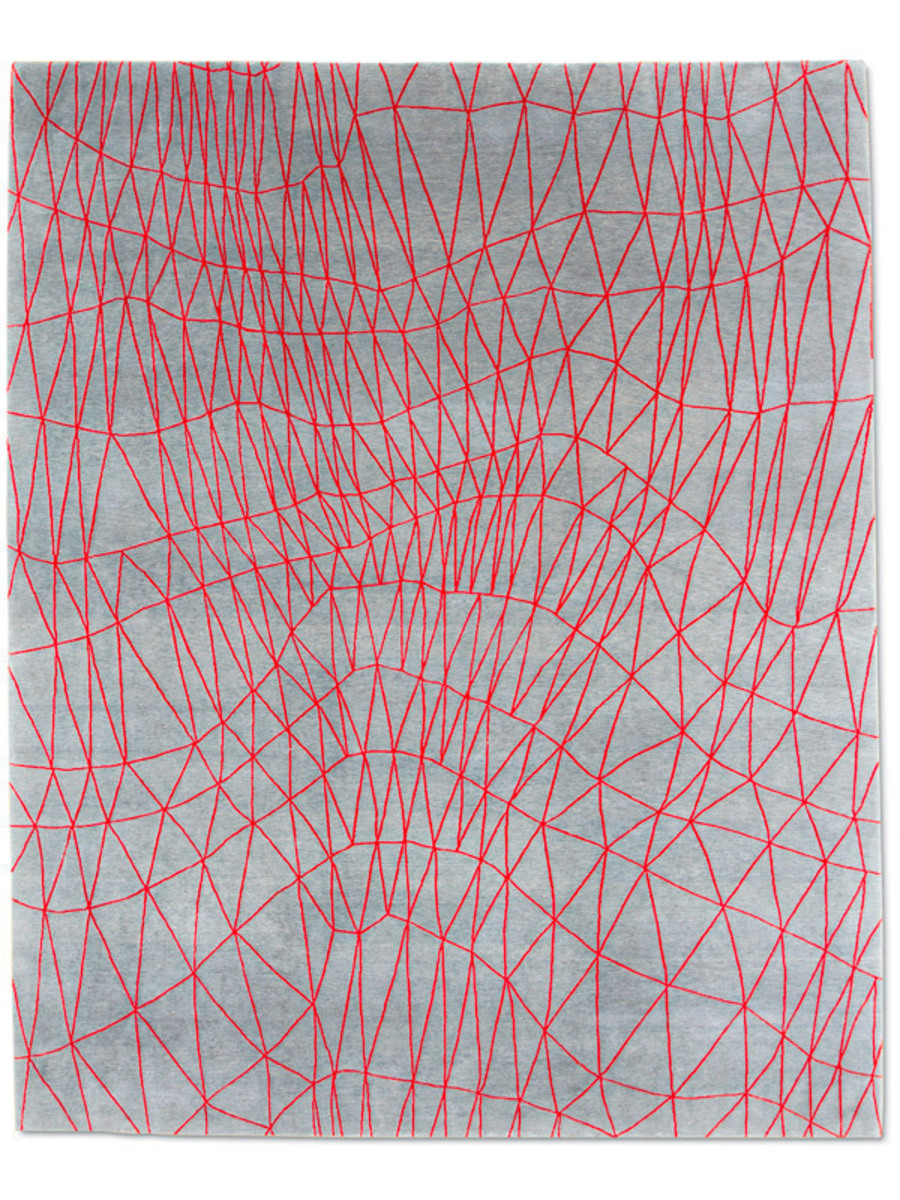 “Scala”, a dancing net of red silk triangles, undulates rhythmically on a deep gray background. Like the modern primitive abstraction of a Paul Klee painting, this lively mesh generates an illusion of constant expansion and contraction. The deliberately distorted and elongated forms playfully remind us of childrens’ drawings, a favorite reference of the designer, Fida Nehme.