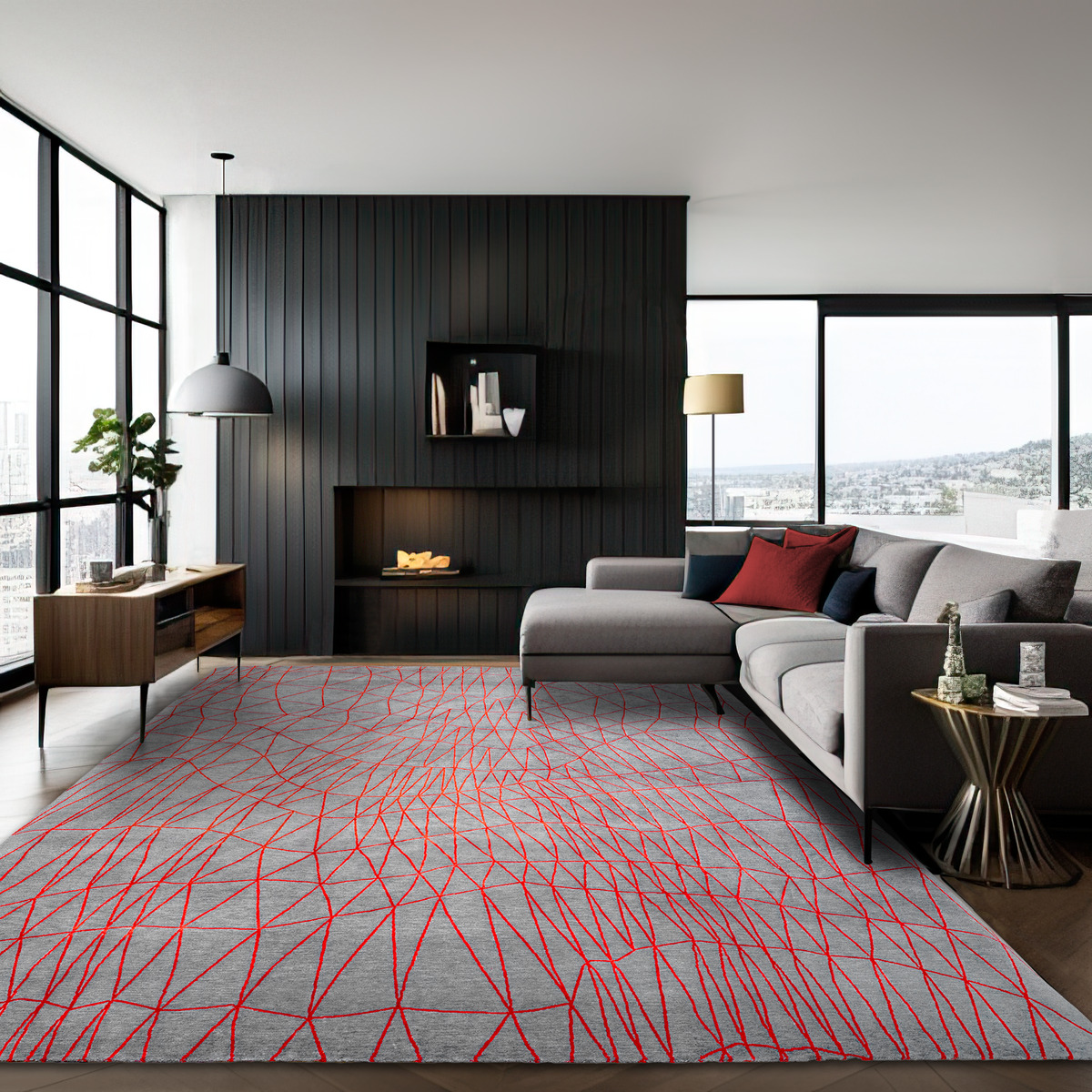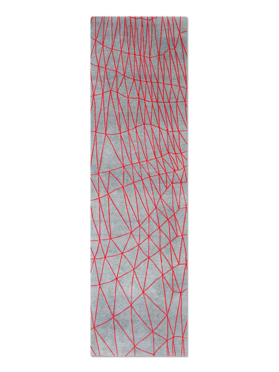 “Scala”, a dancing net of red silk triangles, undulates rhythmically on a deep gray background. Like the modern primitive abstraction of a Paul Klee painting, this lively mesh generates an illusion of constant expansion and contraction. The deliberately distorted and elongated forms playfully remind us of childrens’ drawings, a favorite reference of the designer, Fida Nehme.