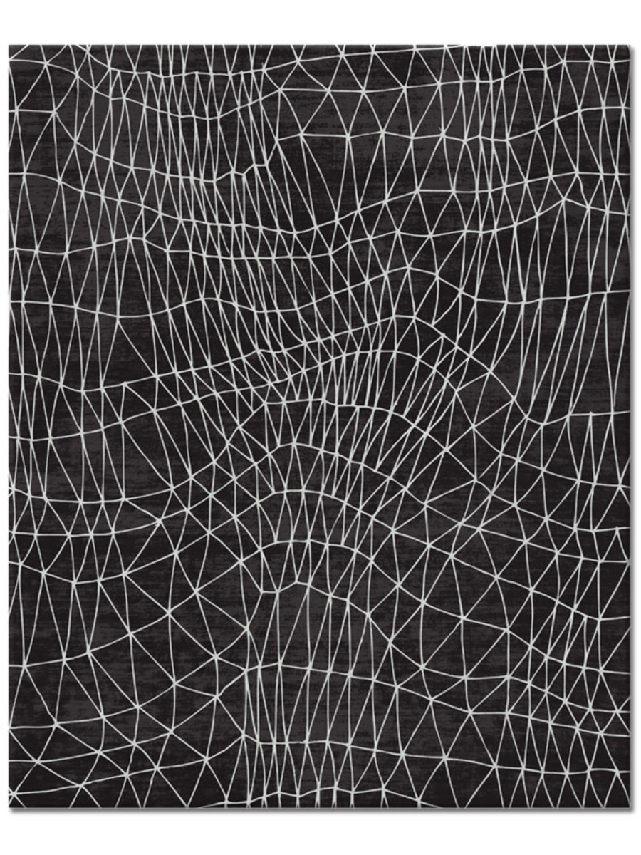 “Scala”, a dancing net of sable silk triangles, undulates rhythmically on a deep black background. Like the modern primitive abstraction of a Paul Klee painting, this lively mesh generates an illusion of constant expansion and contraction. The deliberately distorted and elongated forms playfully remind us of childrens’ drawings, a favorite reference of the designer, Fida Nehme.
