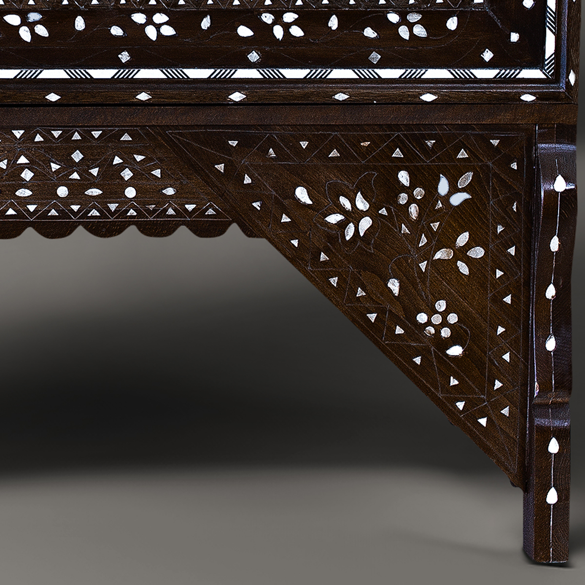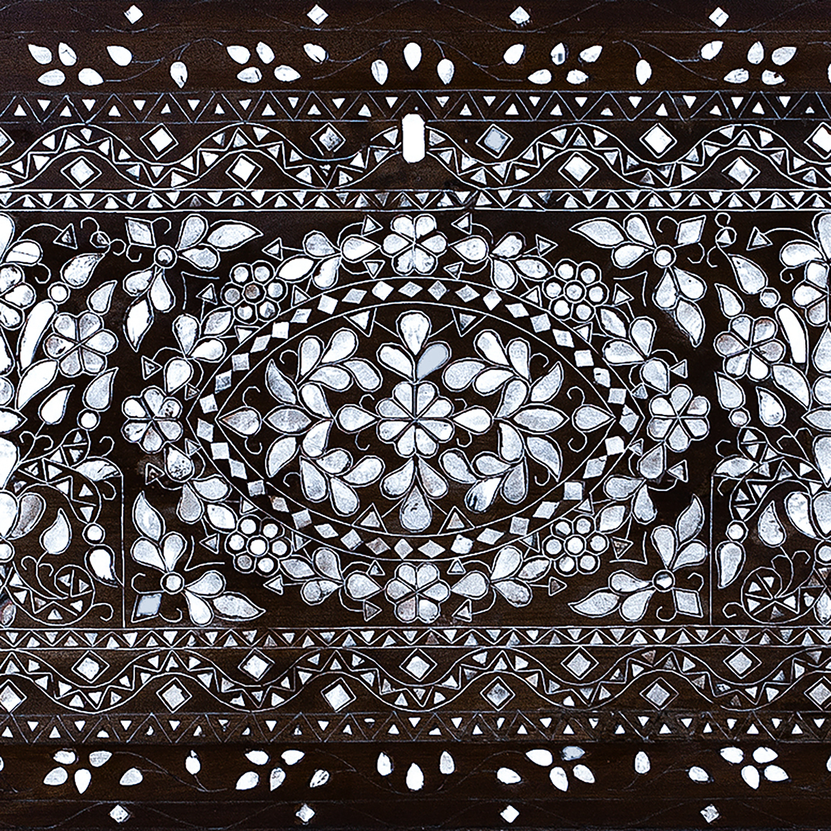 The mother of pearl used in the inlays adds a luxurious dimension to these designs, enhancing their complexity and depth. The lustrous, iridescent quality of the material accentuates the floral patterns, giving them a distinct visual appeal that has captivated generations.