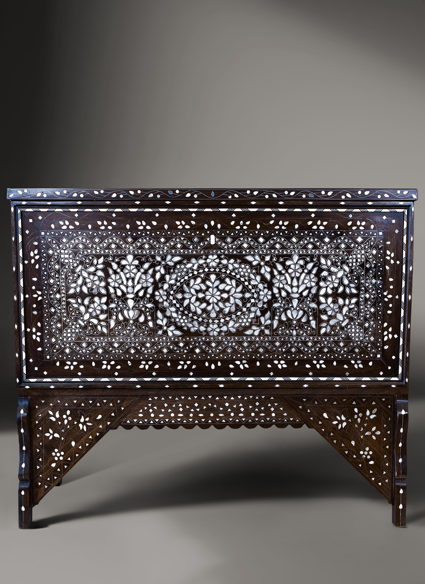 Encircling the central medallion, two rectangular borders gracefully frame the intricate design, separated by a sinuous wave motif that imbues the chest with a fluid sense of movement. The harmonious interplay of shapes and patterns is a testament to the rich cultural heritage of near east artistic tradition, with each element carefully selected to evoke a sense of beauty, harmony, and unity.
