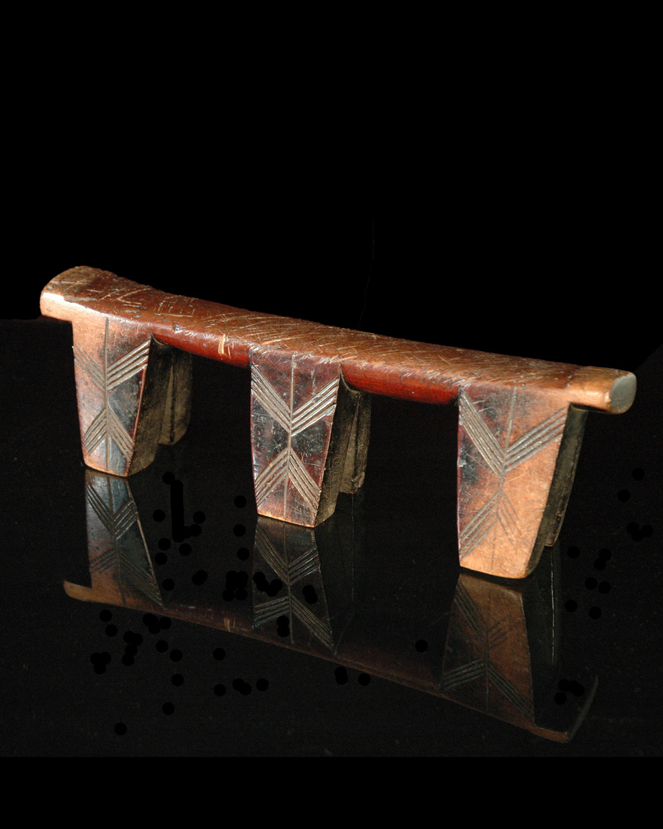 The Zulu people are part of the Nguni, an agrarian, homesteading culture living in Southern Africa. These headrests are hand sculpted from a single, hardwood block, and are either flat or beveled on top. They often feature two or three legs or “links.” (as in this object). By social custom, this headrest is frequently offered to the bridegroom from the bride as an icon of communication with their Zulu ancestors. “(D)reams are considered to be sent by ancestors, and because dreams are dreamt on headrests, the headrest is a kind of antenna, and the strength of the signal is increased if the headrest is inherited from a senior relative” (Nettleton 2007). It is also believed to be symbolic of procreation with cattle, and human descendants, in agrarian societies. Imbued with the masculine quality of “ubunkunzi” (i.e., “like a bull”/“bullness”), the Zulu headrest signifies a virility indispensable to the survival of one’s family and the extended ethnic group.