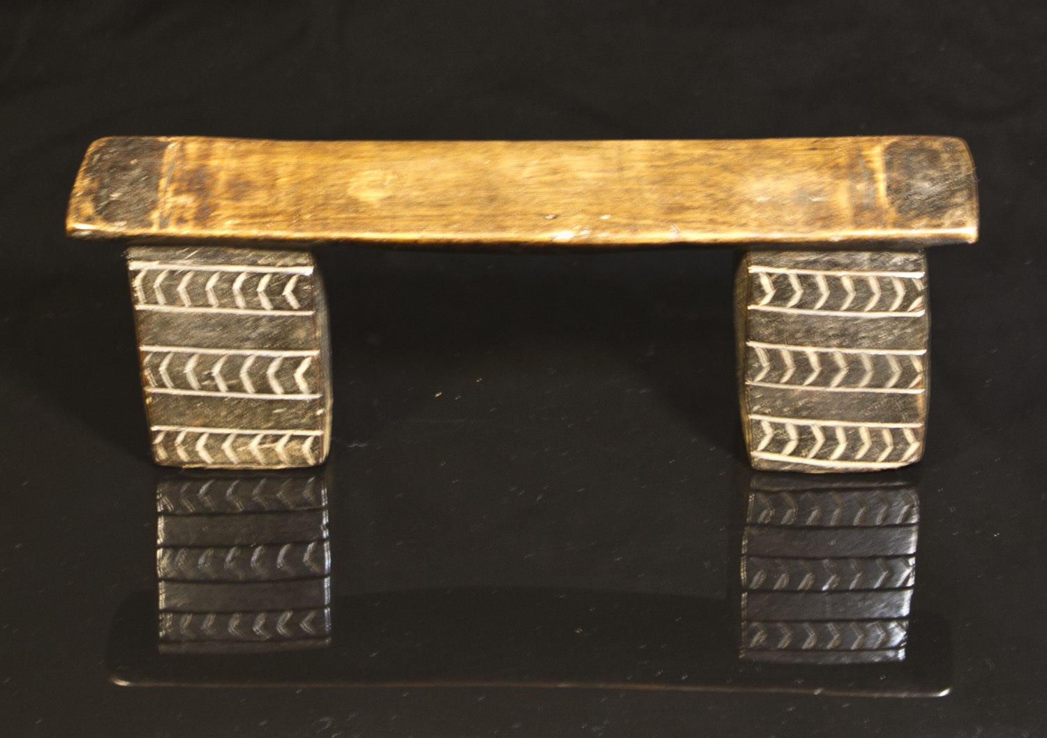 The Zulu people are part of the Nguni, an agrarian, homesteading culture living in Southern Africa. These headrests are hand sculpted from a single, hardwood block, and are either flat or beveled on top. They feature one or more legs or “links.” By social custom, this headrest is frequently offered to the bridegroom from the bride as a vehicle for communication with their Zulu ancestors. “(D)reams are considered to be sent by ancestors, and because dreams are dreamt on headrests, the headrest is a kind of antenna, and the strength of the signal is increased if the headrest is inherited from a senior relative” (Nettleton 2007). It is also believed to be symbolic of procreation with cattle and human descendants in agrarian societies. Imbued with the masculine quality of “ubunkunzi” (i.e., “like a bull”/“bullness”), the Zulu headrest signifies a virility indispensable to the survival of one’s family and the extended ethnic group.